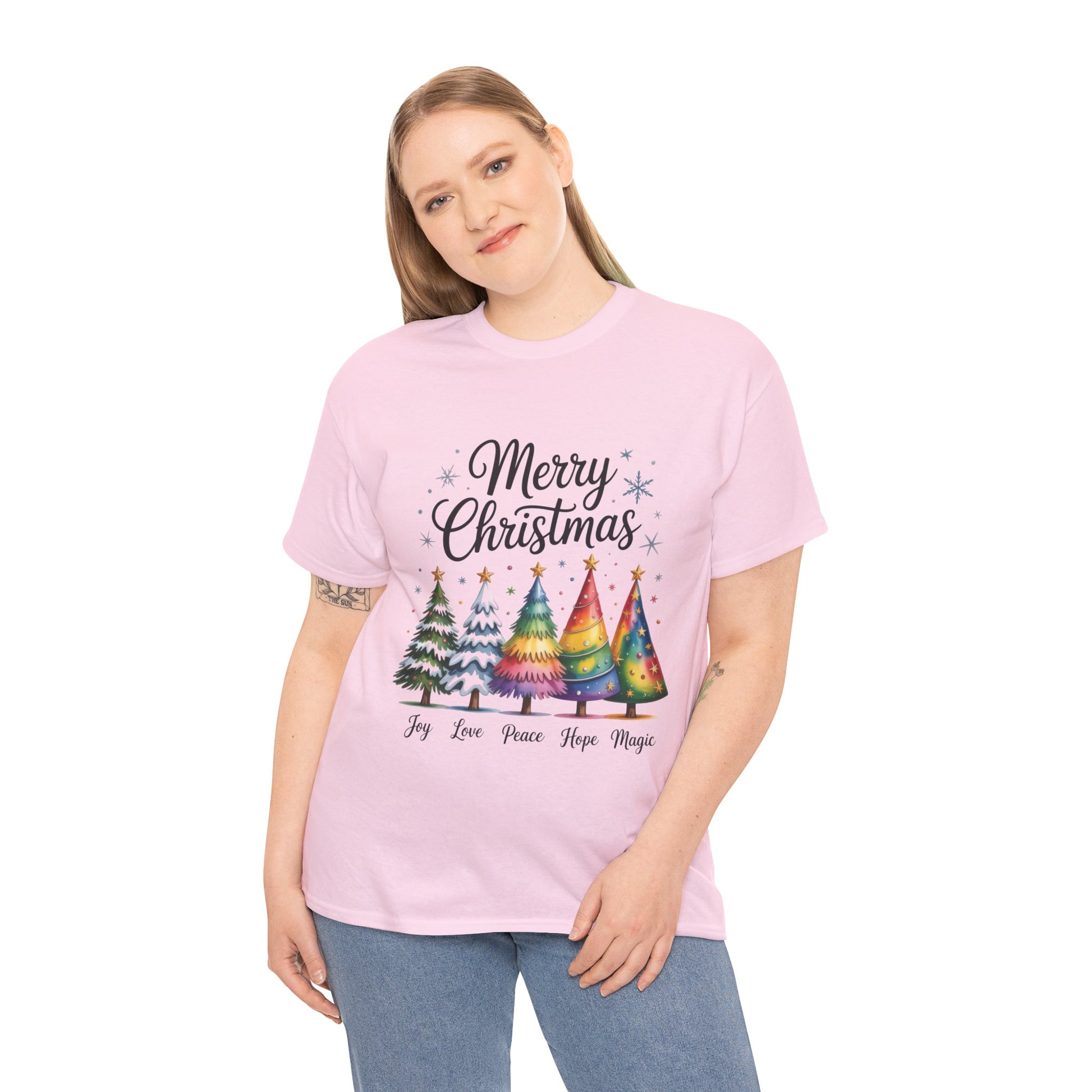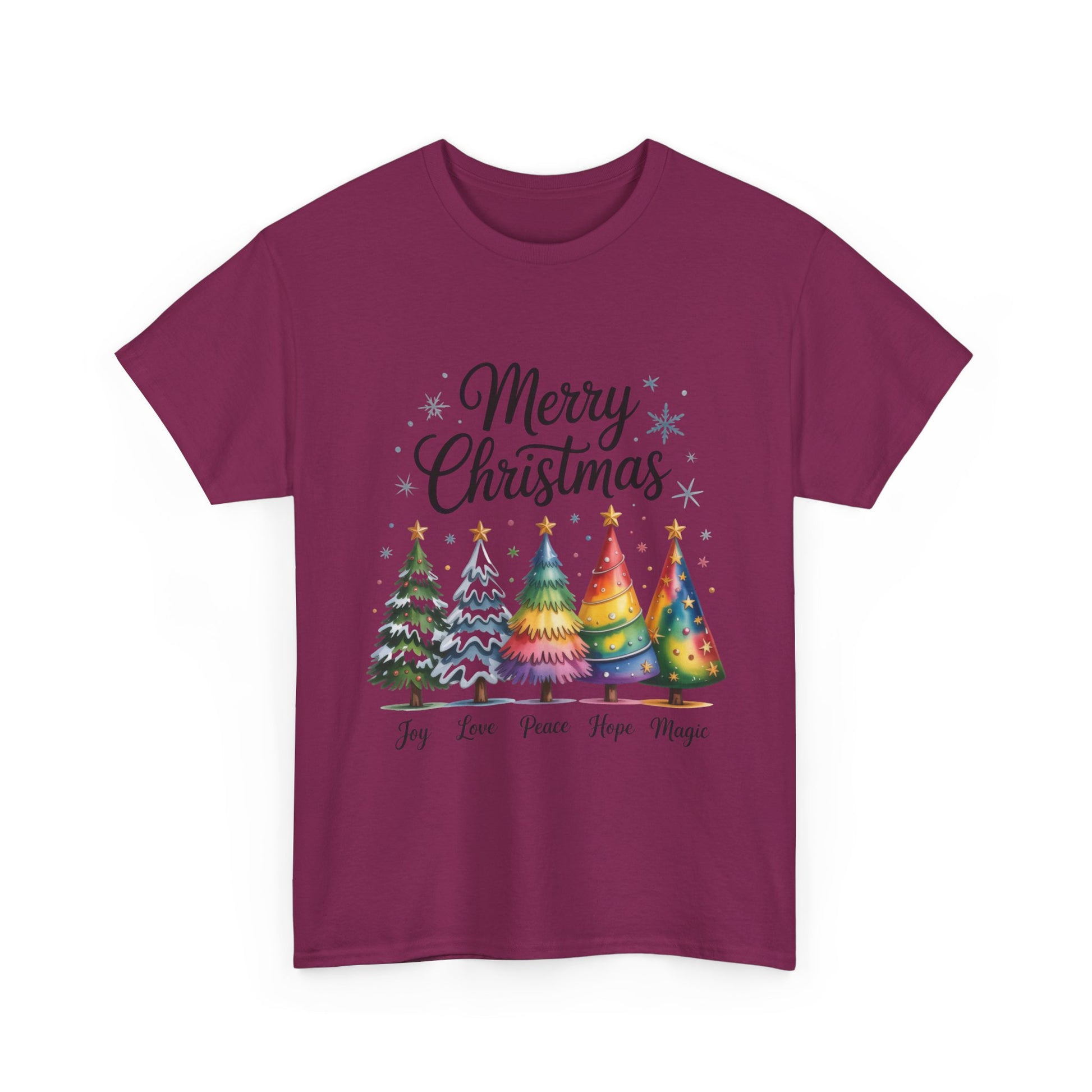 Brighten your holidays with this Merry Christmas T-shirt! The colorful tree design and joyful message — Joy, Love, Peace, Hope, Magic — bring warmth and cheer to your festive style. The Gildan 5000 heavy cotton tee is a dependable classic made for everyday wear and custom printing. Its 100% cotton fabric is tightly knit to give designs sharper detail and long-lasting color. The seamless body eliminates side seams for a smoother fit, while reinforced shoulders keep the shirt in shape through repeated washes. Durable, comfortable, and print-friendly, the Gildan 5000 is a trusted staple for personalized apparel. Disclaimer: - Due to the fabric properties, the White color variant may appear off-white rather than bright white. .: The Gildan 5000 is made with medium fabric (5.3 oz/yd² / 180 g/m²) consisting of 100% cotton, offering year-round comfort with lasting durability. .: The classic fit of this shirt ensures a comfy, relaxed wear while the crew neckline adds that neat, timeless look that can blend into any occasion, casual or semi-formal. .: The tear-away label means a scratch-free experience with no irritation or discomfort whatsoever. .: Made using 100% US cotton that is ethically grown and harvested. Gildan is also a proud member of the US Cotton Trust Protocol ensuring ethical and sustainable means of production. This blank tee is certified by Oeko-Tex for safety and quality assurance.