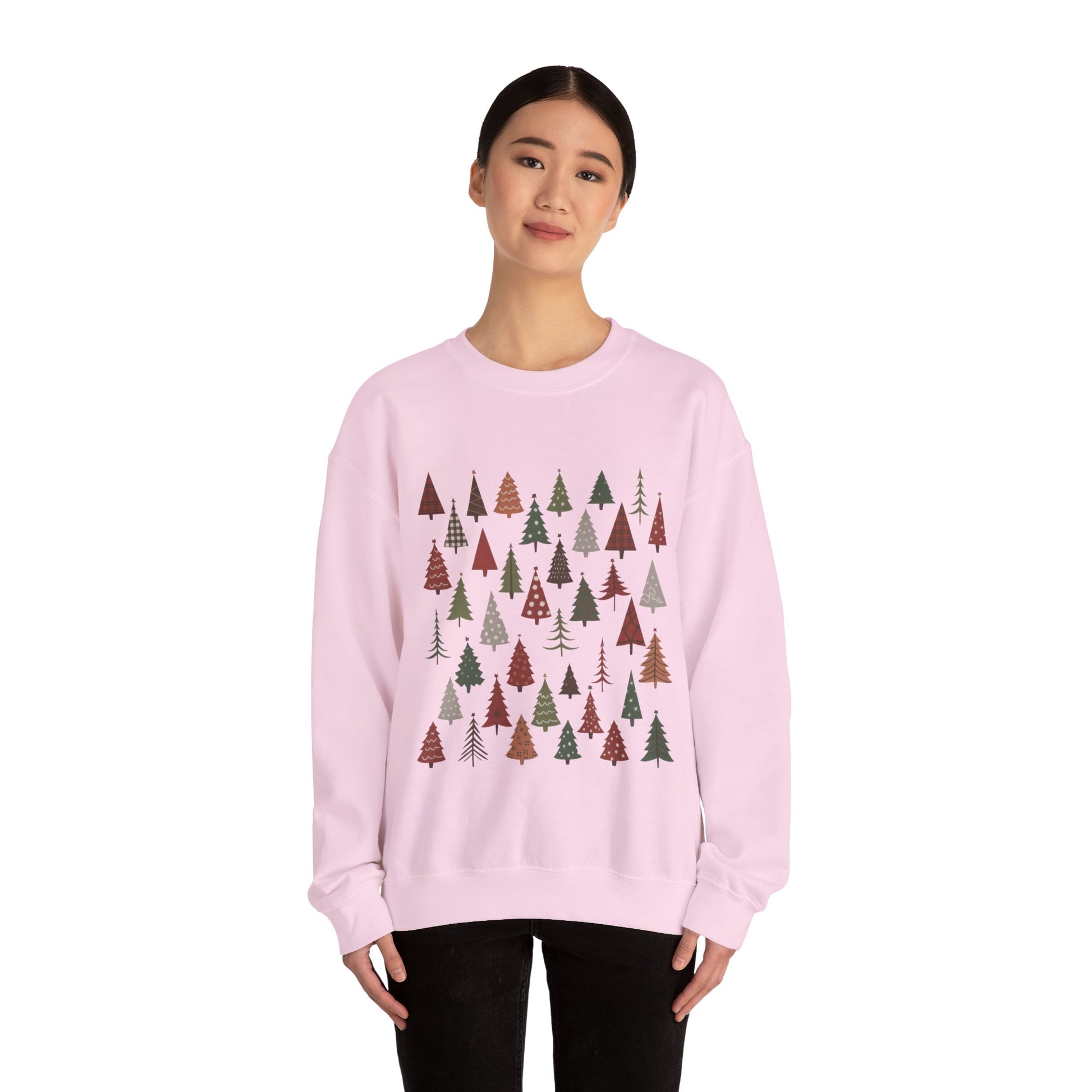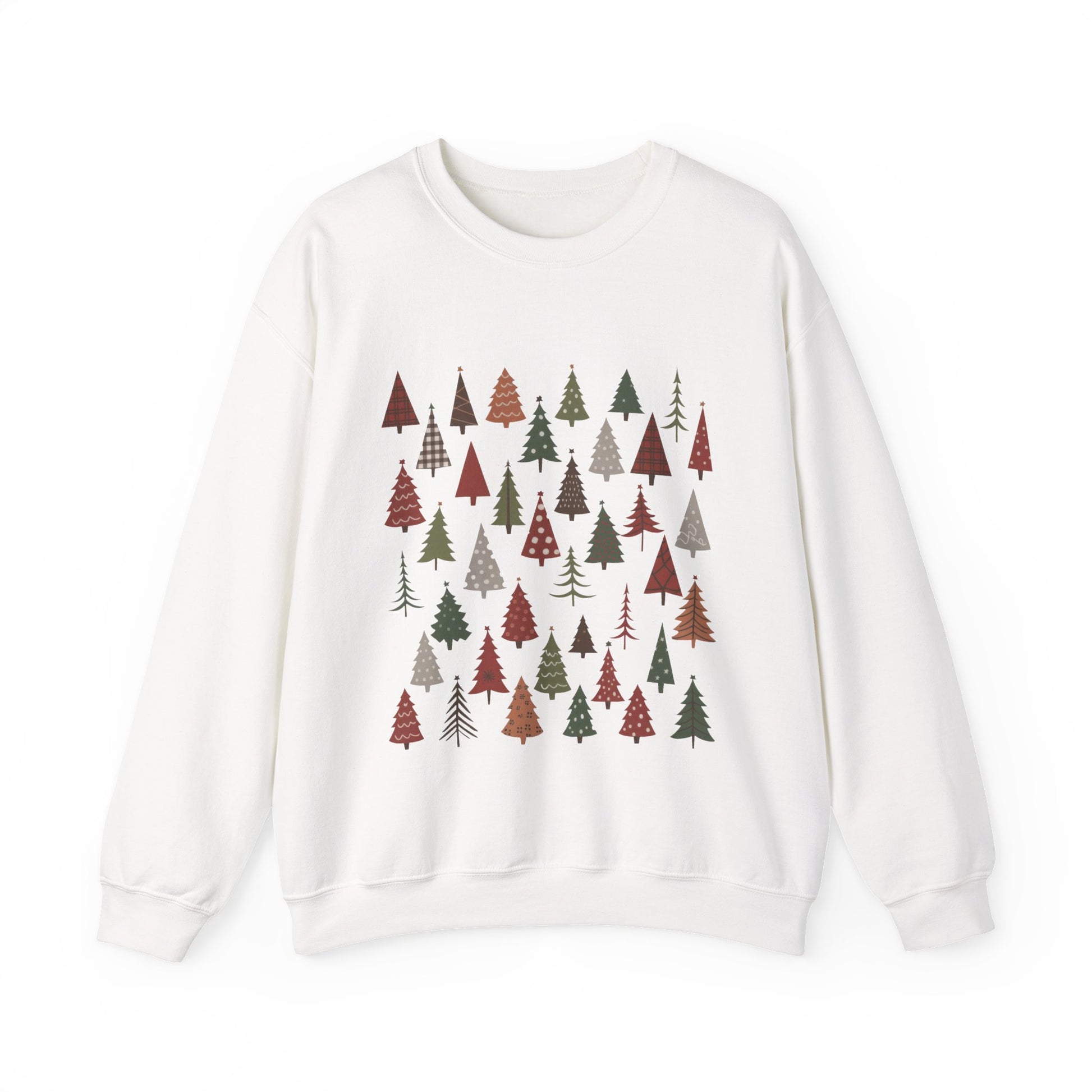 A cozy minimalist Christmas sweatshirt for women, featuring rustic holiday trees in warm tones. A perfect blend of comfort and festive charm for the season. The Gildan 18000 sweatshirt is a unisex heavy blend crewneck made from a 50/50 cotton-polyester fabric, combining softness with lasting durability. Its smooth surface supports crisp, vibrant prints and embroidery, while the ribbed-knit collar and reinforced cuffs help it keep its shape over time. A seamless body design reduces irritation and adds to overall comfort. Practical, sturdy, and print-friendly, the Gildan 18000 sweatshirt remains a top choice for custom apparel. Disclaimers:- Due to the fabric properties, the White color variant may appear off-white rather than bright white. - Subtle orange hue shifts with lighting in the Orange color variant. .: The Gildan 18000 sweatshirt is built for comfort and durability, made from a medium-heavy (8.0 oz/yd² (271 g/m²)) 50/50 cotton-polyester blend. .: The classic fit along with the crew neckline deliver a comfy wearing experience with a clean-cut style. Meanwhile, the double-needle stitching at the shoulder, armhole, neck, waistband, and cuff seams add top-tier durability. .: Say goodbye to itchiness thanks to the gray, pearlized tear-away label. .: The Gildan 18000 sweatshirt is crafted from ethically grown US cotton and backed by the US Cotton Trust Protocol, with OEKO-TEX certified dyes that meet safety and environmental standards. .: Fabric blends: Heather Sport colors - 60% polyester, 40% cotton .: Embroidery decoration method available on either left chest, center chest, or large center chest, as well as right + left wrists
