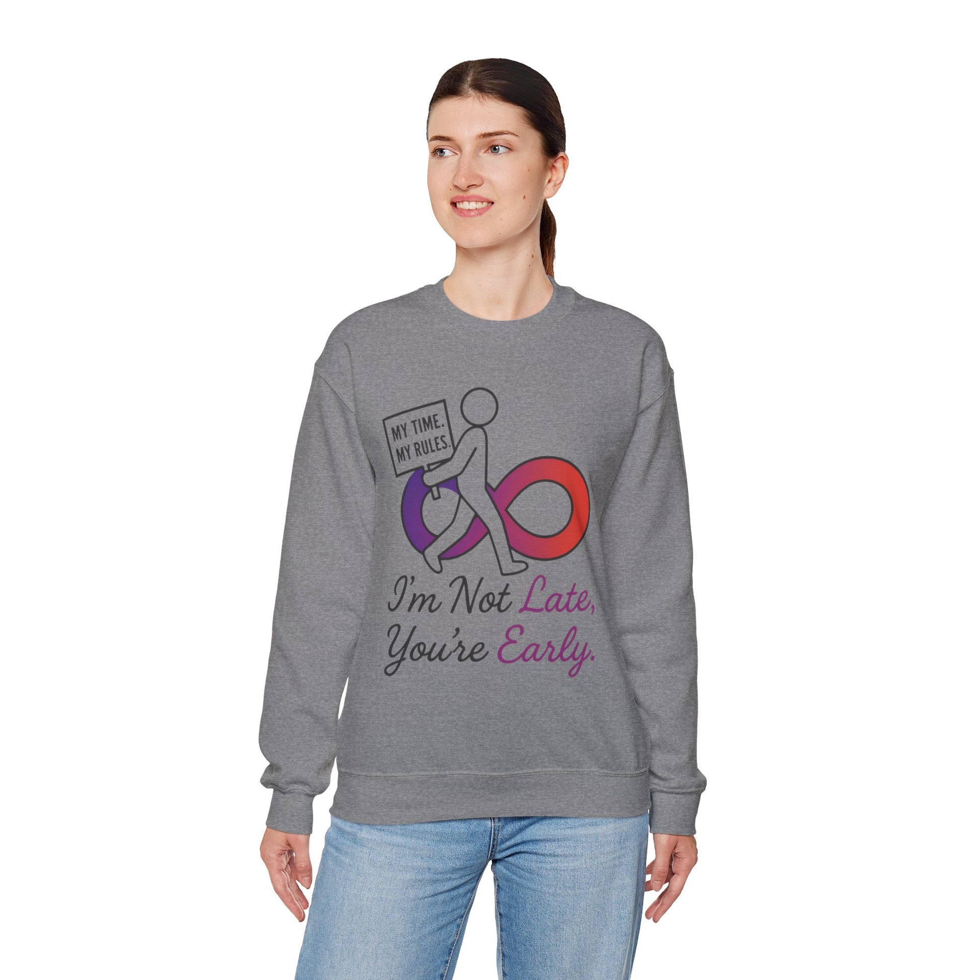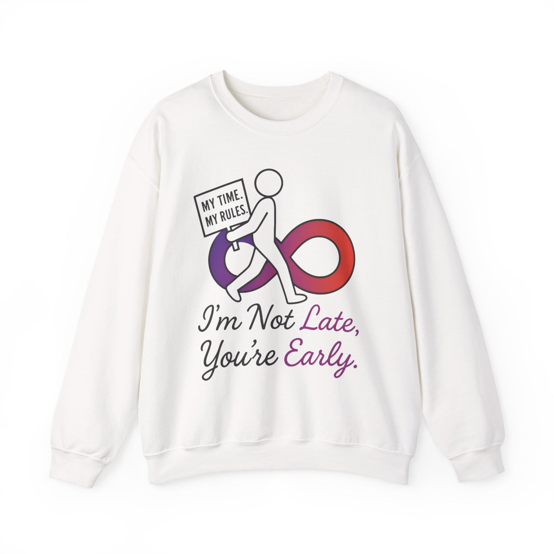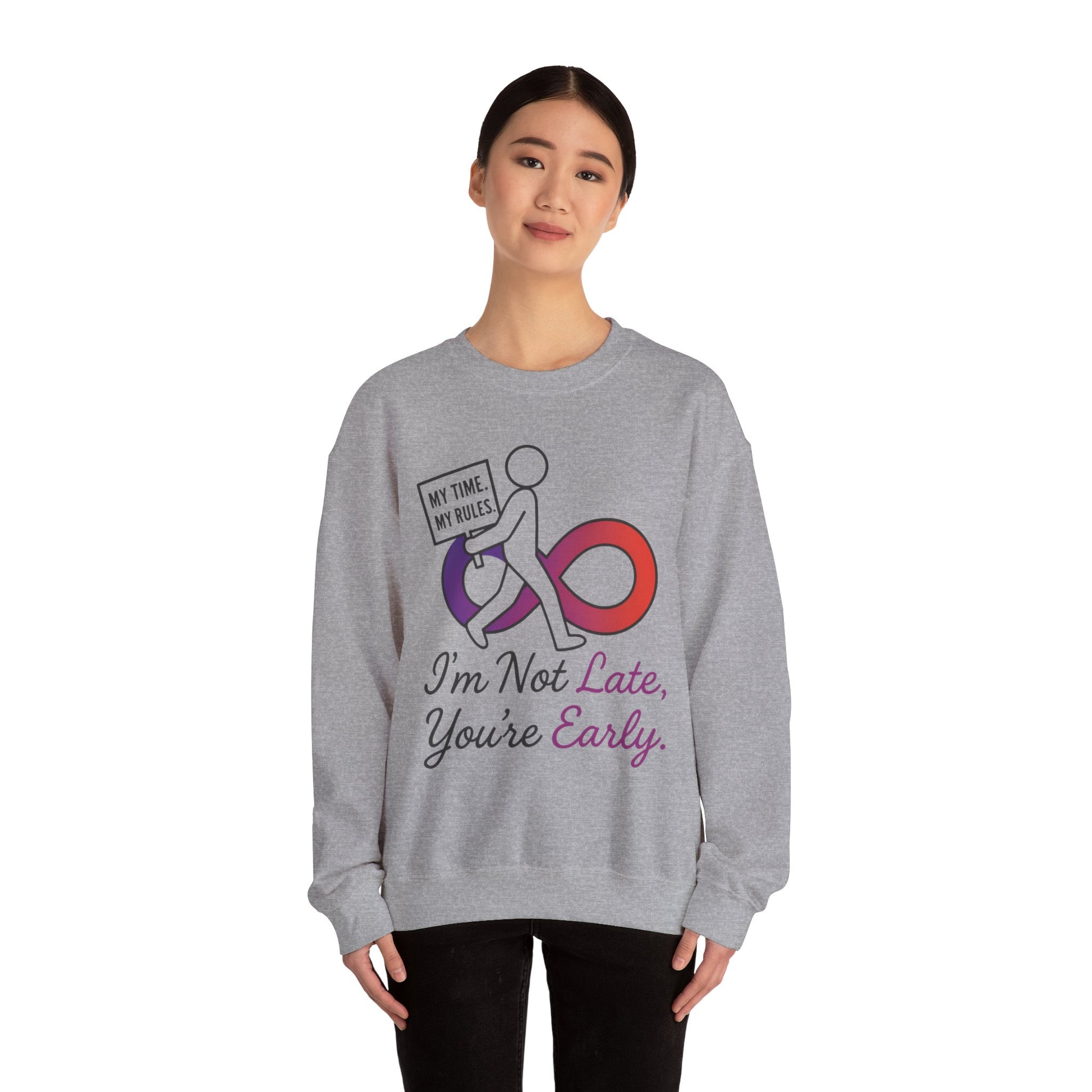 Introducing the perfect blend of comfort and style: this unisex heavy blend crewneck sweatshirt is designed for those who embrace individuality and self-expression. The playful yet thought-provoking message, 'I'm Not Late, You're Early,' makes a bold statement while adding a touch of humor to everyday life. Ideal for casual outings, cozy evenings at home, or even as a conversation starter, this sweatshirt fits seamlessly into any wardrobe. Whether you’re running errands, meeting friends, or simply lounging, this piece is bound to keep you warm and stylish. It’s perfect for students, busy professionals, and anyone looking to add a fun twist to their casual wear. This sweatshirt makes a fantastic gift for birthdays, holidays, or special occasions such as graduations or celebrations of milestones, spreading joy and laughs to those who receive it. Product features - Seamless design for reduced fabric waste - Highly elastic ribbed knit collar retains shape - Made for adults, ensuring a comfortable fit - Manufactured in Nicaragua under strict compliance standards - Crafted from ethically grown US cotton for sustainability Care instructions - Machine wash: cold (max 30C or 90F) - Non-chlorine: bleach as needed - Tumble dry: low heat - Do not iron - Do not dryclean