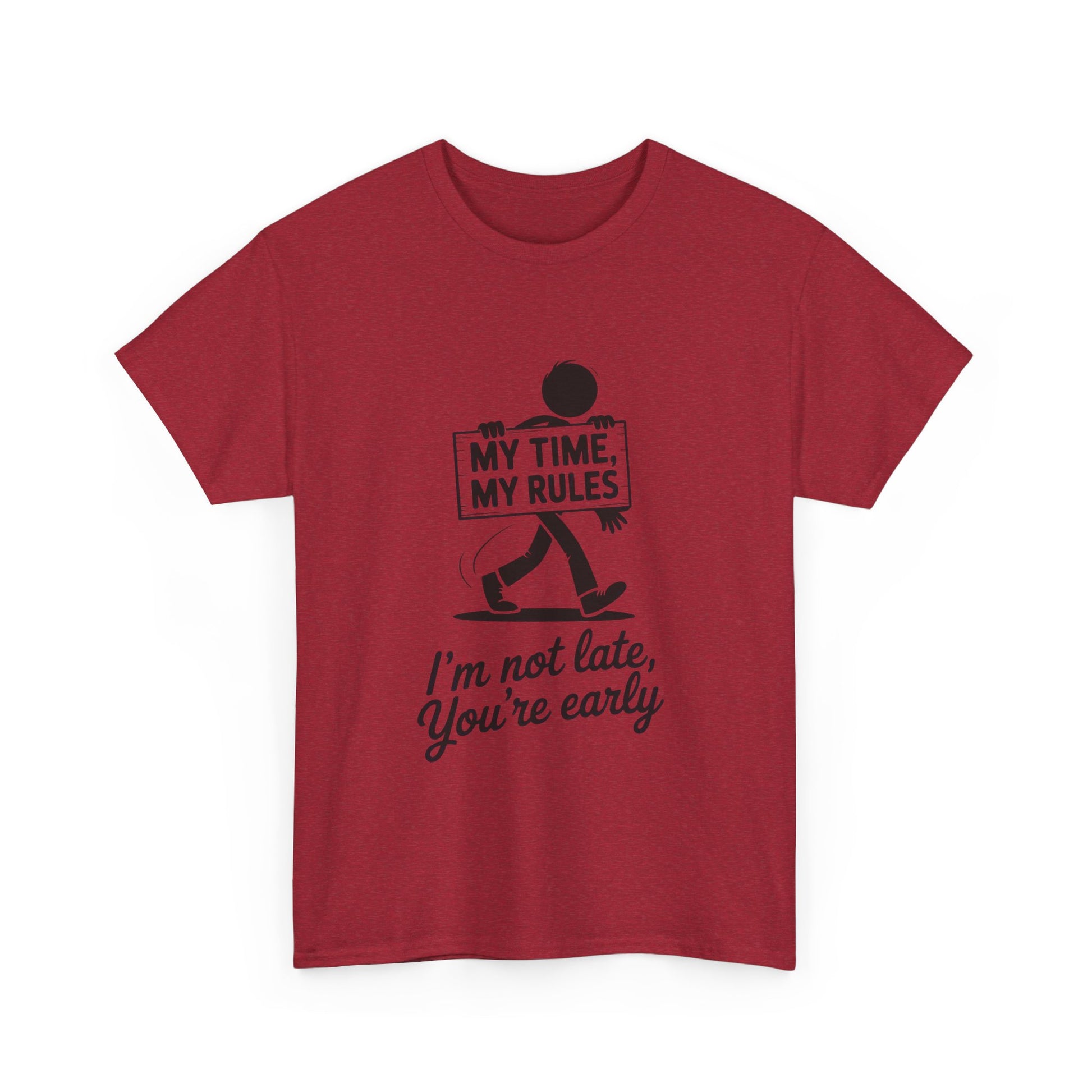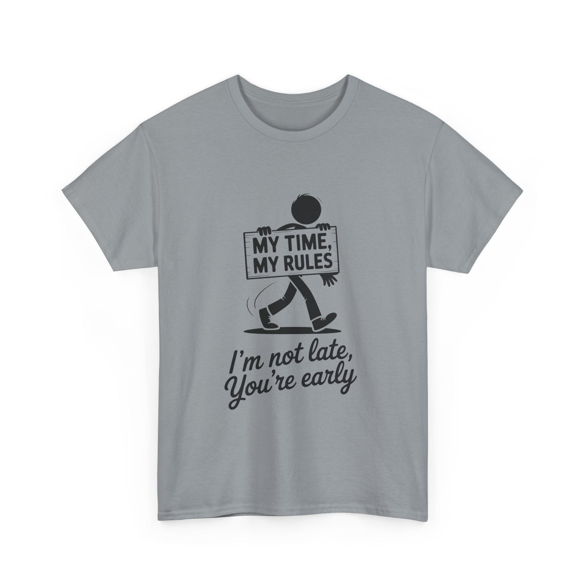 Introducing our Unisex Heavy Cotton Tee, a perfect blend of comfort and style. This shirt exudes a fun, laid-back vibe, making it an ideal choice for those who love to express their personality through their wardrobe. Made with medium fabric and designed for a classic fit, it effortlessly transitions from casual outings to semi-formal gatherings. It's not just a tee; it’s a declaration of independence—"My Time, My Rules!" is sure to spark conversations and laughter. Perfect for everyday wear, this tee is particularly relevant for celebrations like birthdays, casual meet-ups, or just because days. It’s an excellent gift for friends or family members who enjoy a relaxed lifestyle and appreciate a bit of humor in their clothing. Crafted with care for adults, this tee is a staple for anyone who values comfort without compromising on style. Whether you’re lounging at home, hanging out with friends, or running errands, this versatile shirt will have you feeling confident and relaxed. Product features - Shoulder tape for stability and comfort - Made without side seams to reduce waste - Ribbed collar that retains its shape - Durable fabric perfect for printing - Ethically grown 100% US cotton Care instructions - Non-chlorine: bleach as needed - Do not iron - Do not dryclean - Machine wash: cold (max 30C or 90F) - Tumble dry: low heat
