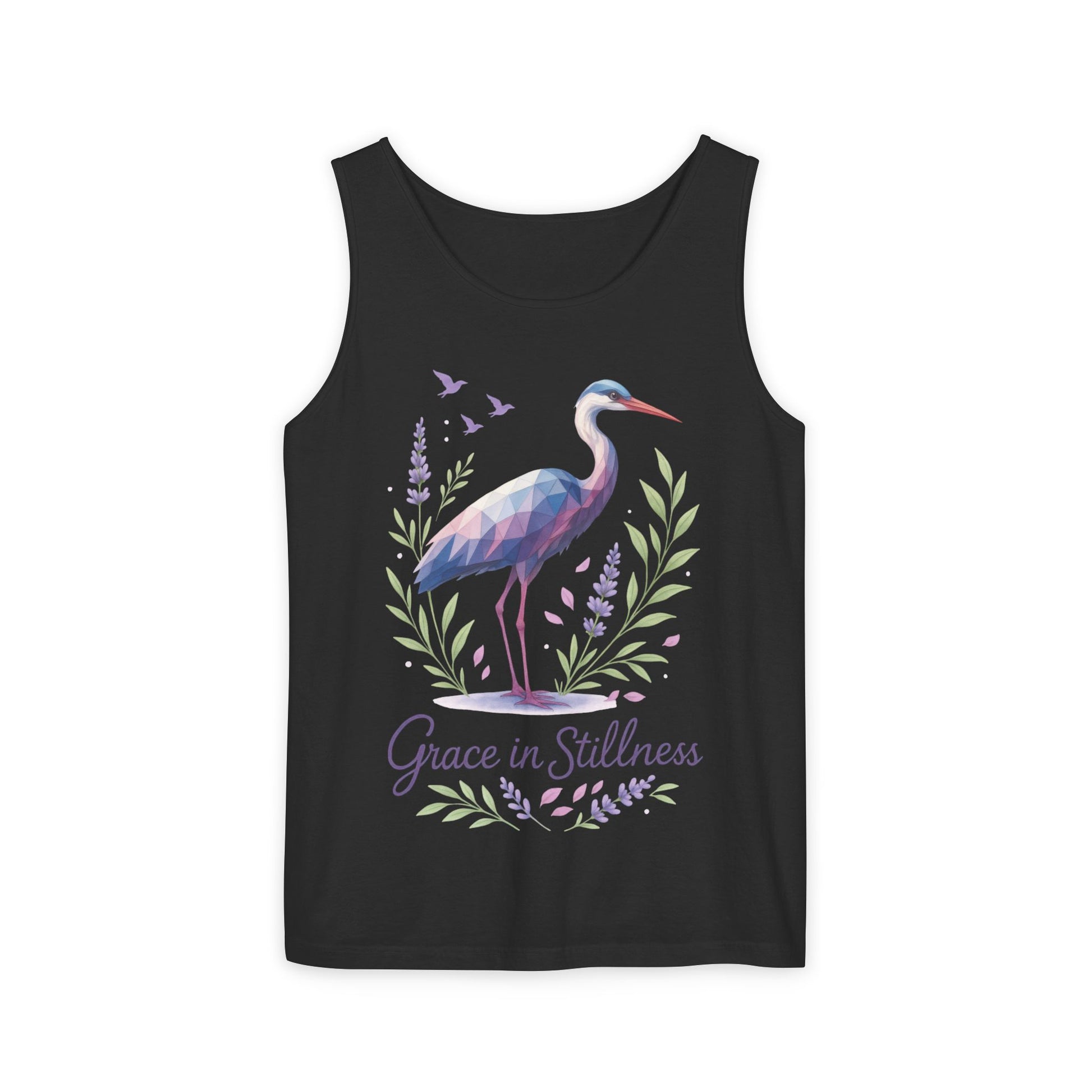 This unisex tank top embodies a serene and elegant vibe, perfect for those warm sunny days or casual nights out. The beautiful design features a graceful heron surrounded by delicate flora, inspiring a sense of tranquility and connection to nature. Ideal for nature lovers and those looking to express their unique style, this tank top is a versatile addition to any wardrobe. Wear it during the summer months, for outdoor gatherings, yoga sessions, or as a relaxing piece to enjoy at home. It's suitable for gifting on occasions such as birthdays, Earth Day, or whenever you want to brighten someone’s day with thoughtful apparel. Product features - 100% ring-spun cotton for a soft and durable feel. - Self-fabric binding for a clean, polished look. - No side seams enhance comfort and reduce fabric waste. - Garment-dyed for a unique, soft color and texture. - Relaxed fit for ultimate comfort in warm weather. Care instructions - Machine wash: cold (max 30C or 90F) - Non-chlorine: bleach as needed - Tumble dry: low heat - Iron, steam or dry: low heat - Do not dryclean