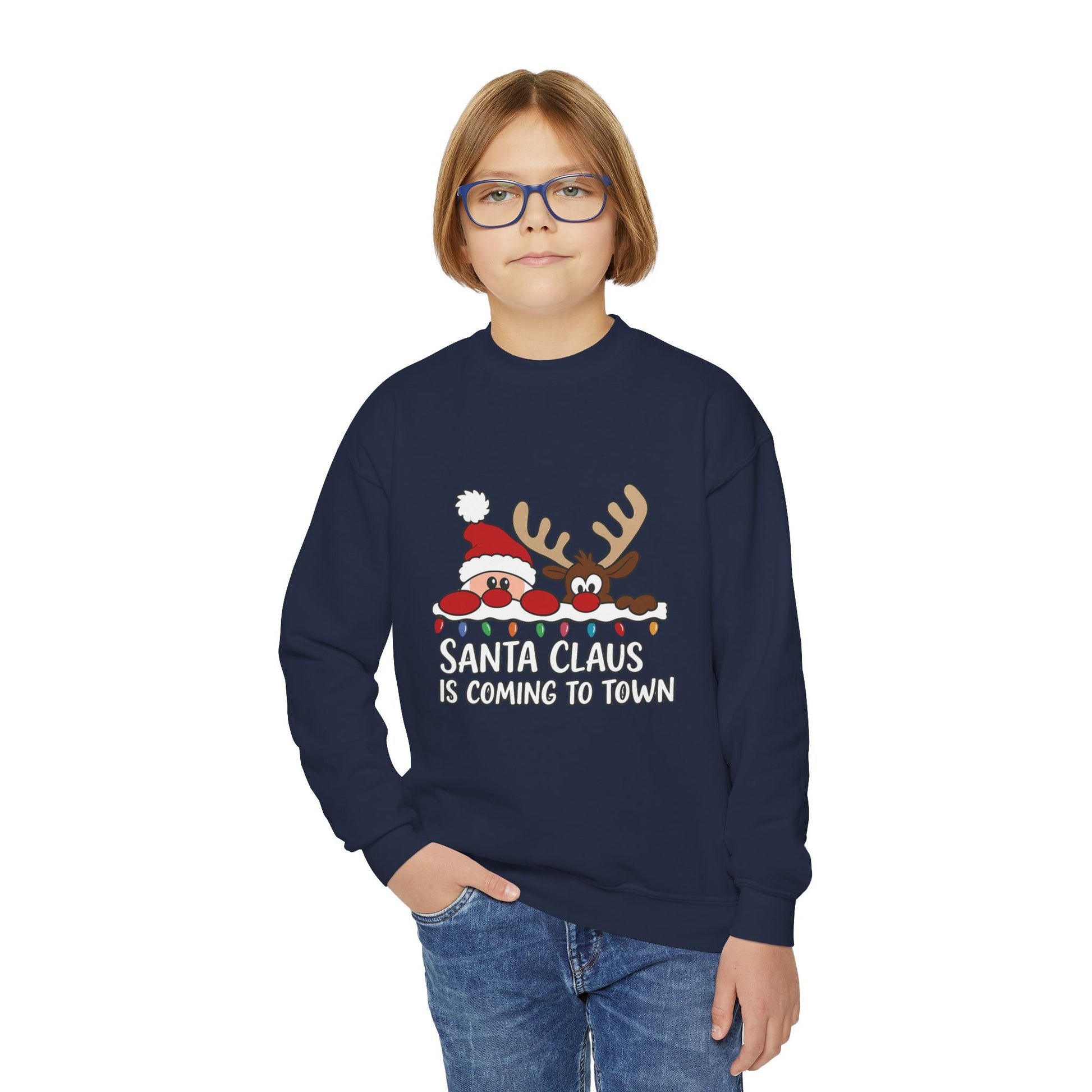 Santa Claus Is Coming to Town Kids Christmas Sweatshirt, Cute Santa - Reindeer Holiday Jumper