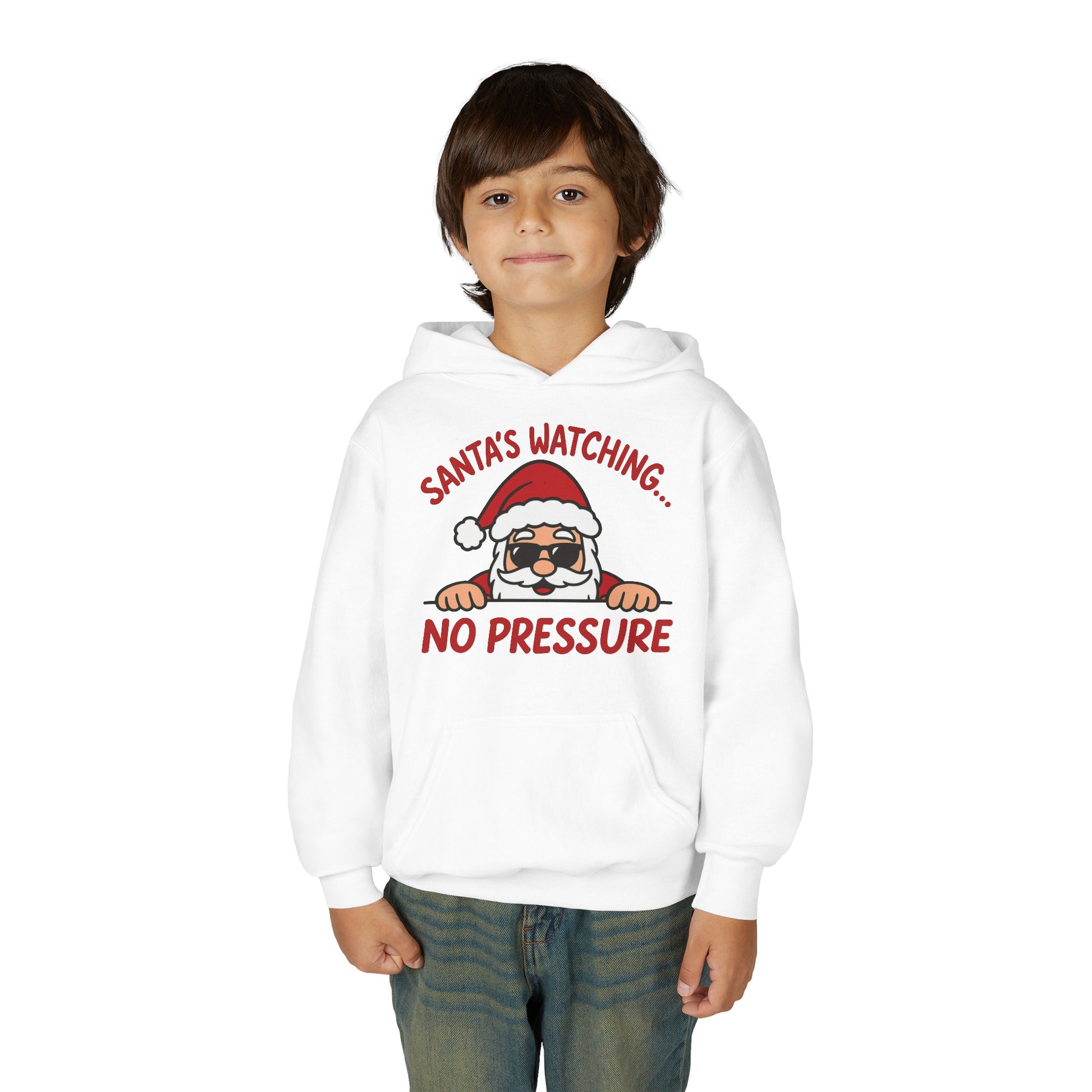 Let your kids spread smiles this season with our “Santa’s Watching… No Pressure” hoodie! Soft, warm, and full of Christmas humor — perfect for festive days, family photos, and cozy winter fun. The youth blend hooded sweatshirt is made of ultra-soft, preshrunk fleece that feels wonderful against the skin. The garment is 50% cotton 50% polyester with reduced lint buildup. This makes an excellent combination for printing. The front has a kangaroo pocket big enough for both hands. The neck is reinforced with twill taping. Disclaimer: - Due to the fabric properties, the White color variant may appear off-white rather than bright white. .: 50% cotton, 50% polyester (fiber content varies for different colors) .: Medium fabric (8.0 oz /yd² (271 g/m²)) .: Regular fit .: Sewn in label .: Runs true to size .: Embroidery decoration method available on left chest or center chest