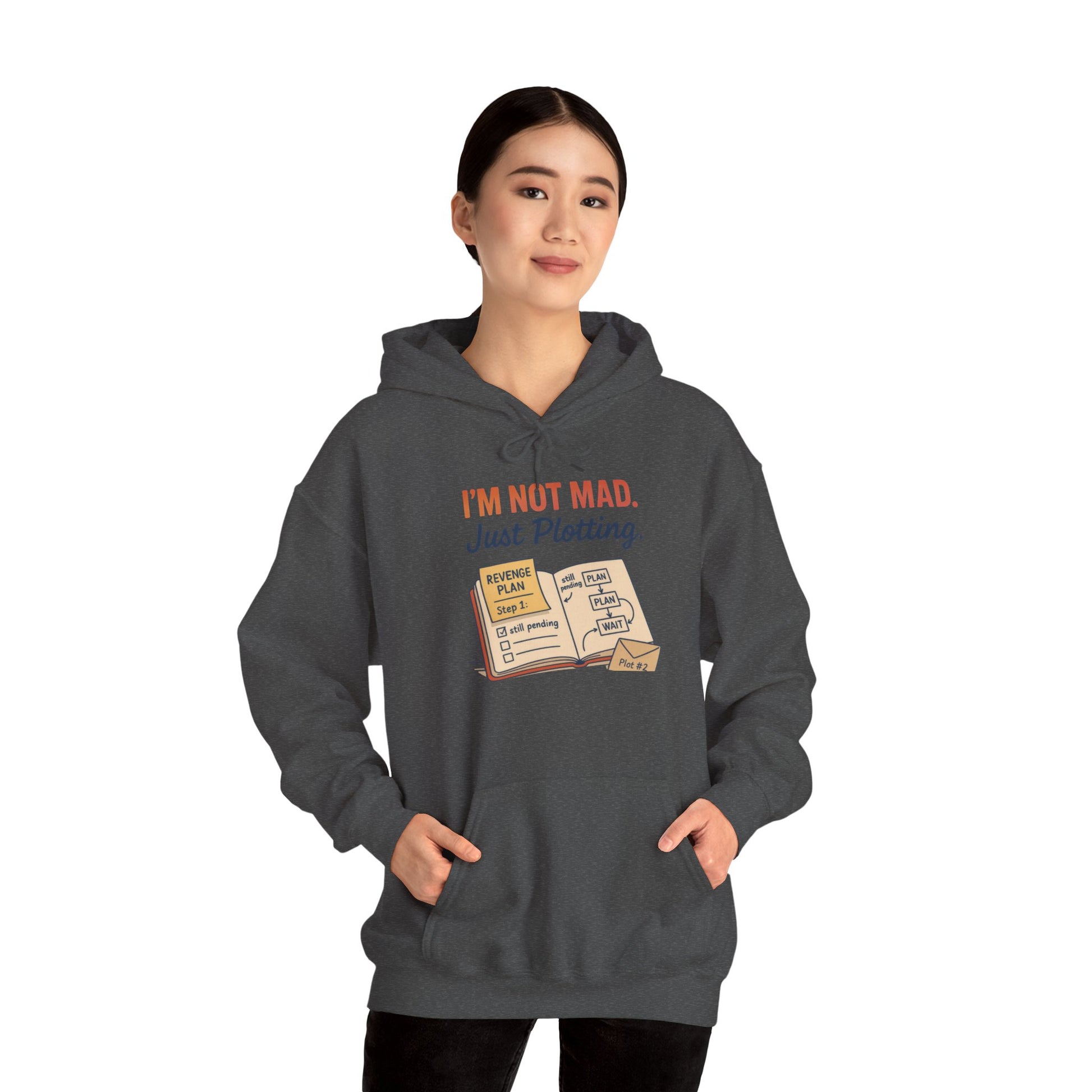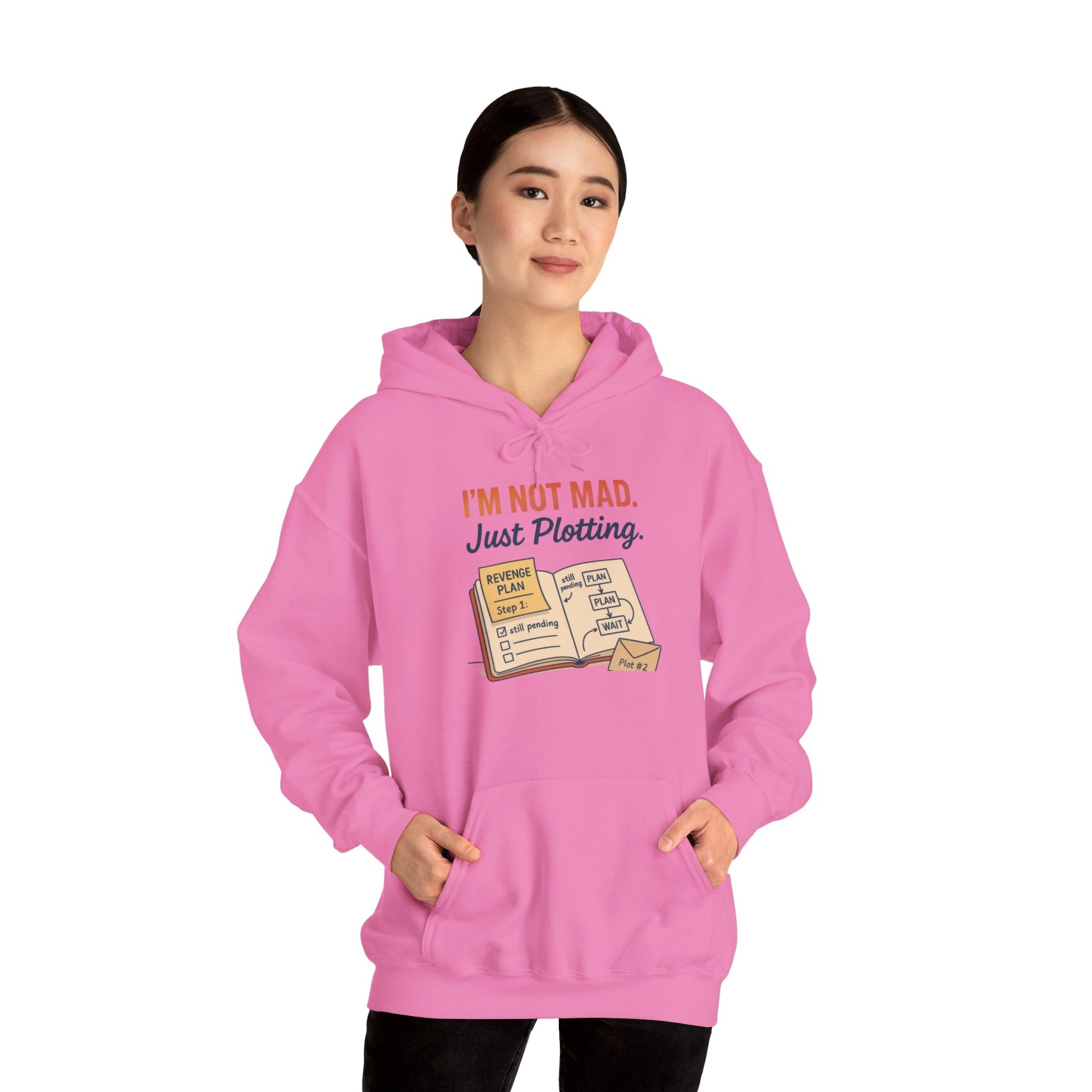 Embrace comfort and humor with this cozy hoodie, perfect for all casual occasions. The playful message "I'm Not Mad, Just Plotting" adds a lighthearted touch to your wardrobe, making it an ideal choice for creative thinkers, writers, or anyone who enjoys a good laugh. The unisex design ensures a relaxed fit for everyone, making it suitable for both lounging at home and outings with friends. This hoodie brings warmth and style to chilly days, making it great for holidays like Thanksgiving or cozy evenings by the fire during winter. Gift it for birthdays, writing retreats, or just because! Product features - Spacious kangaroo pouch pocket for warmth and convenience - Adjustable drawstring hood for a personalized fit - Seamless design reduces waste and enhances aesthetics - Durable fabric blend (50% cotton, 50% polyester) for softness and resilience - Embroidery options for a personal touch, available on left or center chest Care instructions - Tumble dry: medium - Iron, steam or dry: low heat - Do not dryclean - Machine wash: cold (max 30C or 90F) - Non-chlorine: bleach as needed