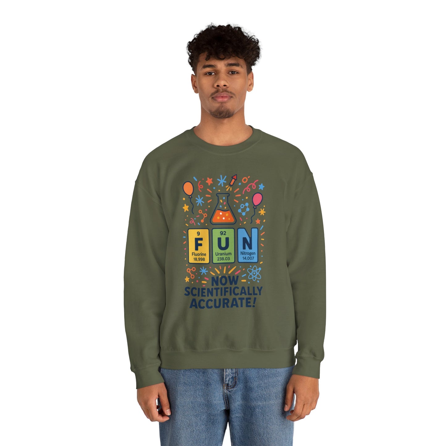 Stay cozy and stylish with this Unisex Heavy Blend™ Crewneck Sweatshirt, featuring a whimsical design perfect for anyone who loves a touch of fun. The playful graphics celebrate science in a colorful, engaging way, making it an ideal choice for teachers, students, and science enthusiasts alike. Whether you're lounging at home or attending casual gatherings, this sweatshirt adds a pop of personality and warmth to your outfit. It’s perfect for cooler weather and makes a thoughtful gift for birthdays, holiday parties, or just because. Let this sweatshirt be your new go-to, spreading cheer and comfort wherever you go! Product features - Knit in one piece without side seams, reducing fabric waste. - Elastic ribbed knit collar helps retain shape and durability. - Medium-heavy fabric blend (50% cotton, 50% polyester) offers cozy warmth. - Ethically made with US cotton, ensuring sustainable production. - Available with embroidery decoration options for a personalized touch. Care instructions - Machine wash: cold (max 30C or 90F) - Non-chlorine: bleach as needed - Tumble dry: low heat - Do not iron - Do not dryclean
