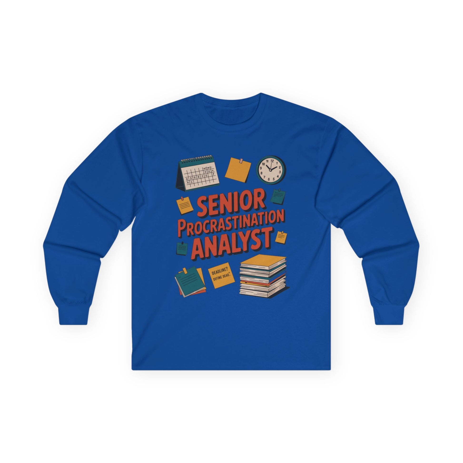 Senior Procrastination Analyst Long Sleeve Tee, Funny Work Shirt, Gift for Analysts, Office Humor Shirt, Meme Shirt, Motivation Apparel