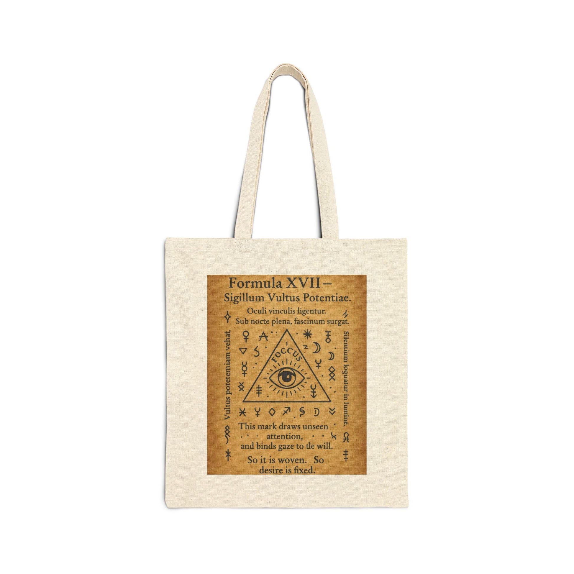 Designed for those who walk with intention and speak in symbols. This tote features Sigillum Vultus Potentiae — a triangle-bound gaze, surrounded by cryptic markings and mystic alignment. This symbolic design plays with themes of unseen focus, attraction of energy, and the subtle force of presence. A unique choice for those drawn to esoteric aesthetics, ritual symbolism, or simply a bold artistic statement. Printed on durable cotton canvas, this bag blends utility with visual ritual. Whether used as a daily carry or personal token, it’s meant to be both seen and felt. Note: This item is for decorative and inspirational purposes only. No magical or metaphysical claims are made. This durable Cotton Canvas Tote Bag is perfect for those on-the-go moments, whether you're heading to the market, the beach, or simply running errands. Its sturdy design and classic vibe make it a stylish companion for every outing. The unmistakable natural aesthetic brings warmth and charm to any outfit, making it an ideal choice for eco-conscious shoppers and anyone who appreciates practical design with a touch of elegance. The tote bag is relevant for students, teachers, and busy professionals alike, providing a reliable way to carry essentials. It's also a wonderful gift for friends and family during special occasions such as birthdays, holidays, or as a thoughtful gesture for someone who enjoys sustainable living. Embrace your individuality and let this tote bag showcase your personality in every setting. Product features - 100% cotton canvas for durability and strength - Flat corners for a streamlined look - Reinforced carrying handles for comfortable use - Heavy fabric weight ensures longevity - Available in both natural and black colors for versatility Care instructions - Do not iron directly over the printed area - print may stick to the iron. - Spot clean - Do not bleach - Line dry