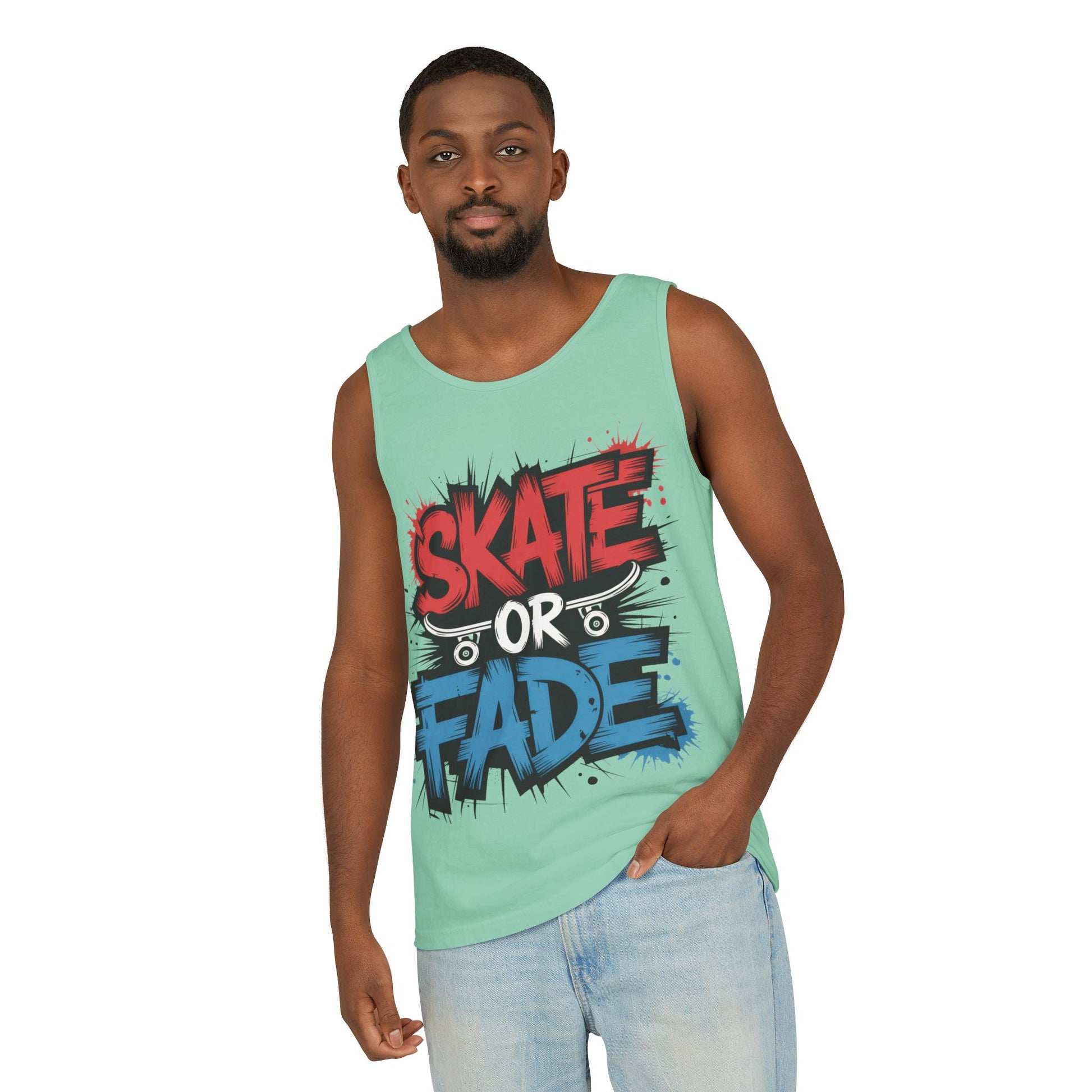 Skate Or Fade Men's Tank Top, Graffiti Skateboard Graphic Muscle Shirt, Urban Streetwear Sleeveless Top, Men's Garment-Dyed Tank Top