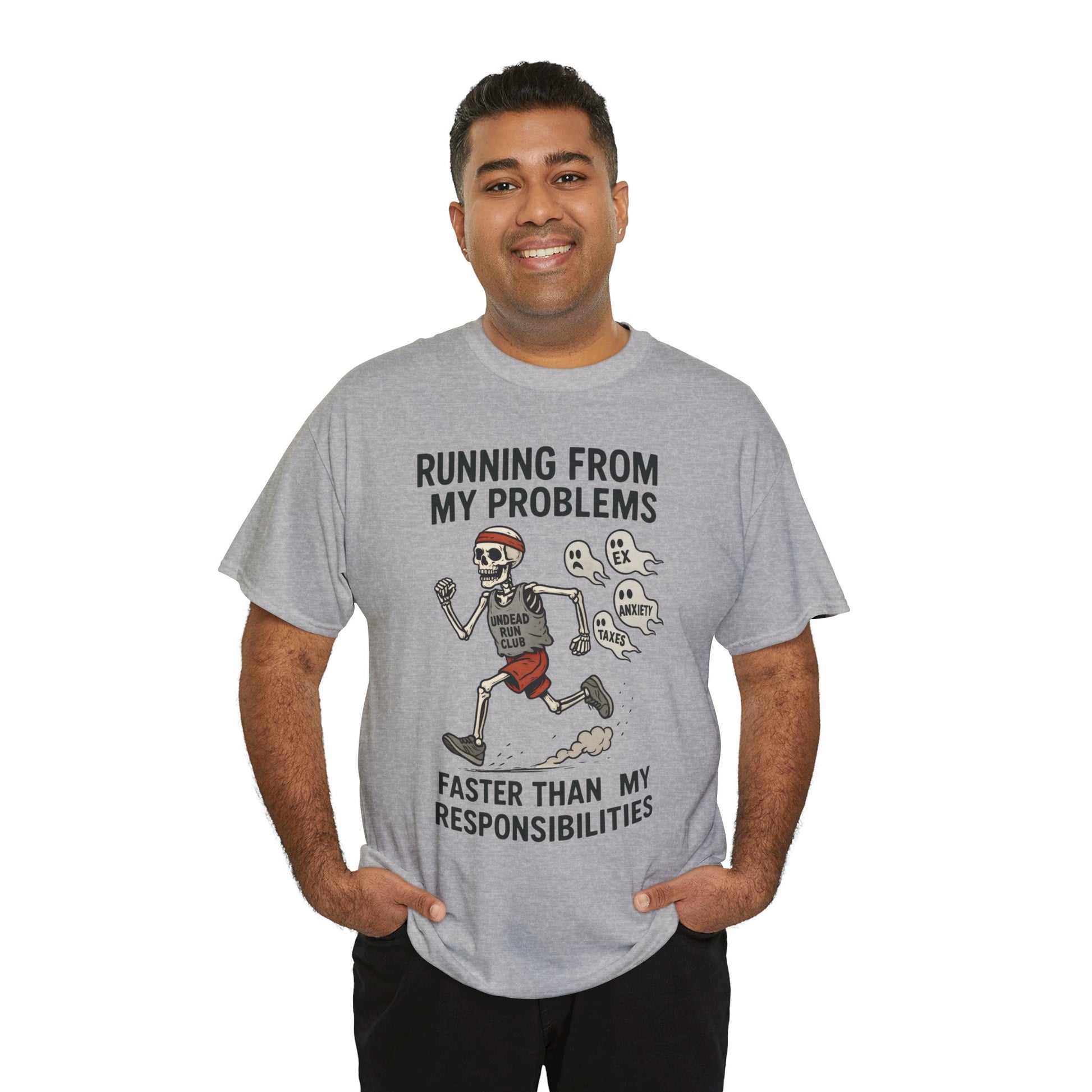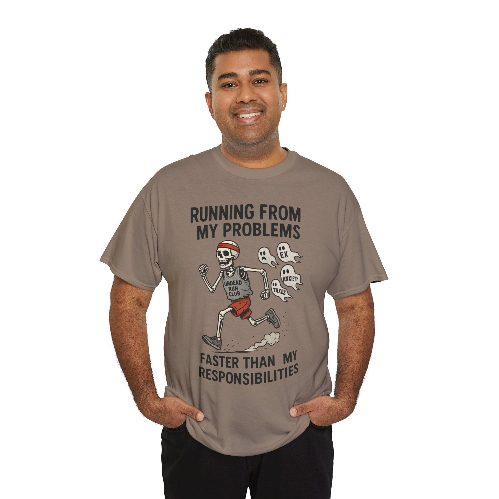 Introducing this unisex heavy cotton tee, perfect for those who love a blend of comfort and quirky style. The unique design—featuring a playful skeleton running from its problems—adds a whimsical touch to your casual outfit, making it a great conversation starter. Ideal for everyday wear, this tee is perfect for all occasions, whether you're out with friends or lounging at home. Lightweight and breathable, it’s designed for year-round wear, making it a staple in your wardrobe. This t-shirt resonates with individuals who appreciate humor and casual fashion, making it a perfect gift for Halloween, casual get-togethers, or any laid-back celebration! Product features - Shoulder tape for added stability and reduced stretching - Seamless design minimizes fabric waste and enhances aesthetic appeal - Elastic ribbed collar retains its shape for a polished look - Crafted from a strong, smooth fabric suitable for vibrant printing - Ethically made with 100% US cotton, ensuring comfort and sustainability Care instructions - Non-chlorine: bleach as needed - Do not iron - Do not dryclean - Machine wash: cold (max 30C or 90F) - Tumble dry: low heat