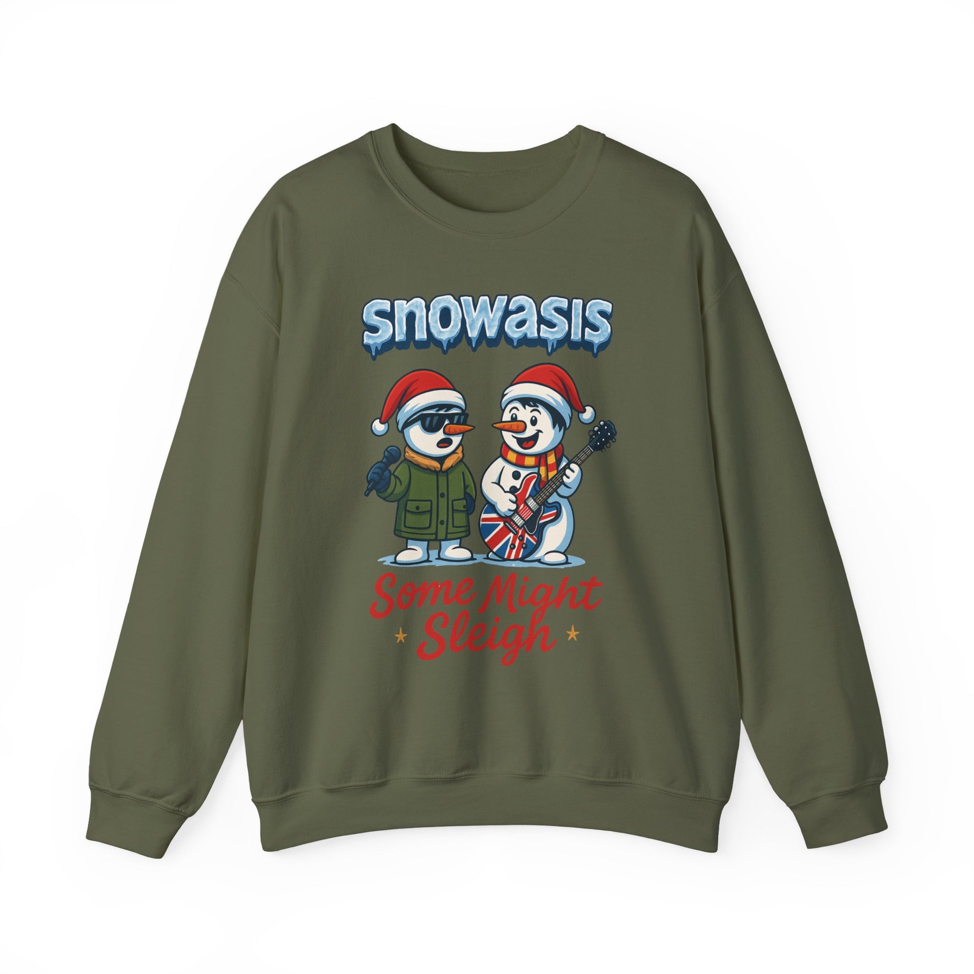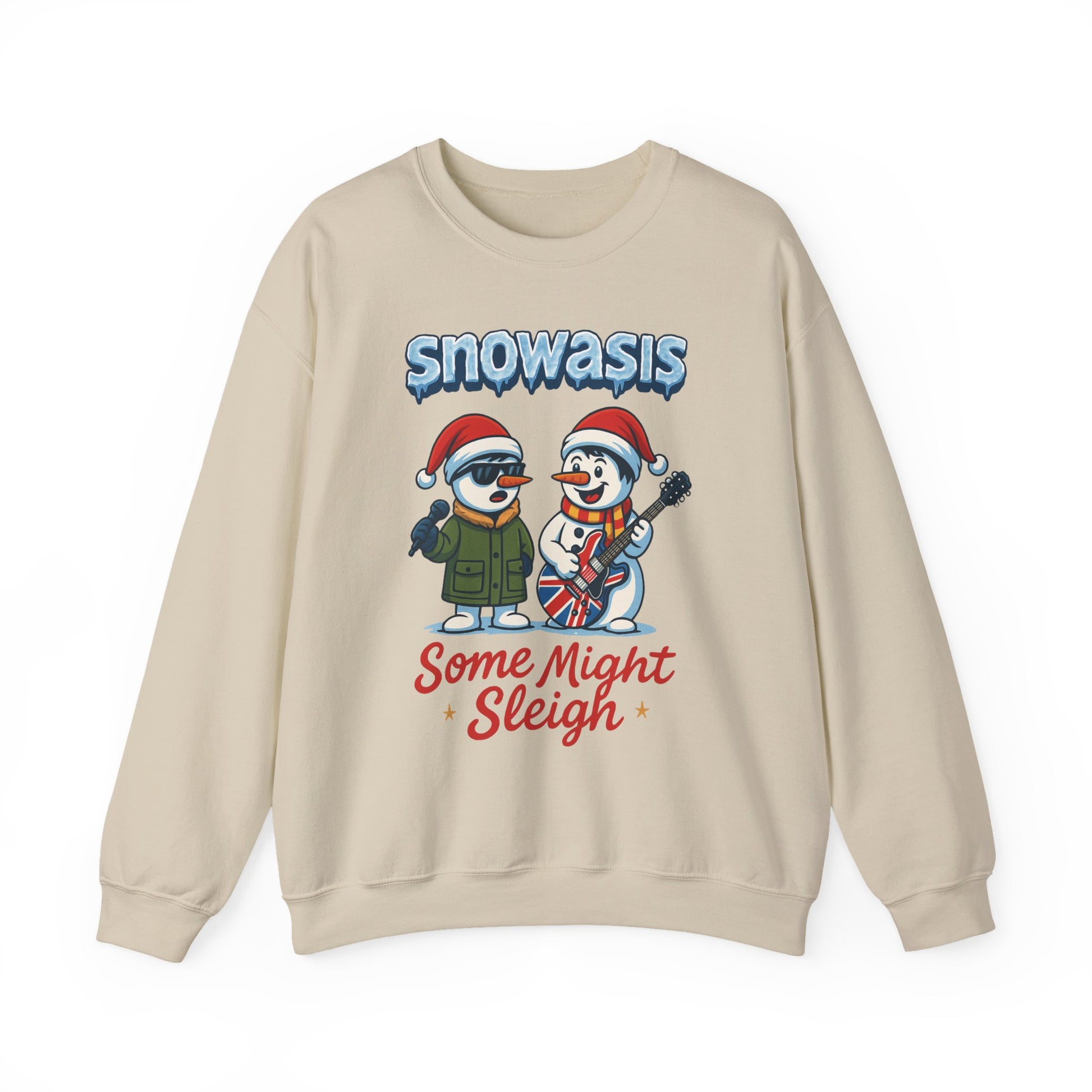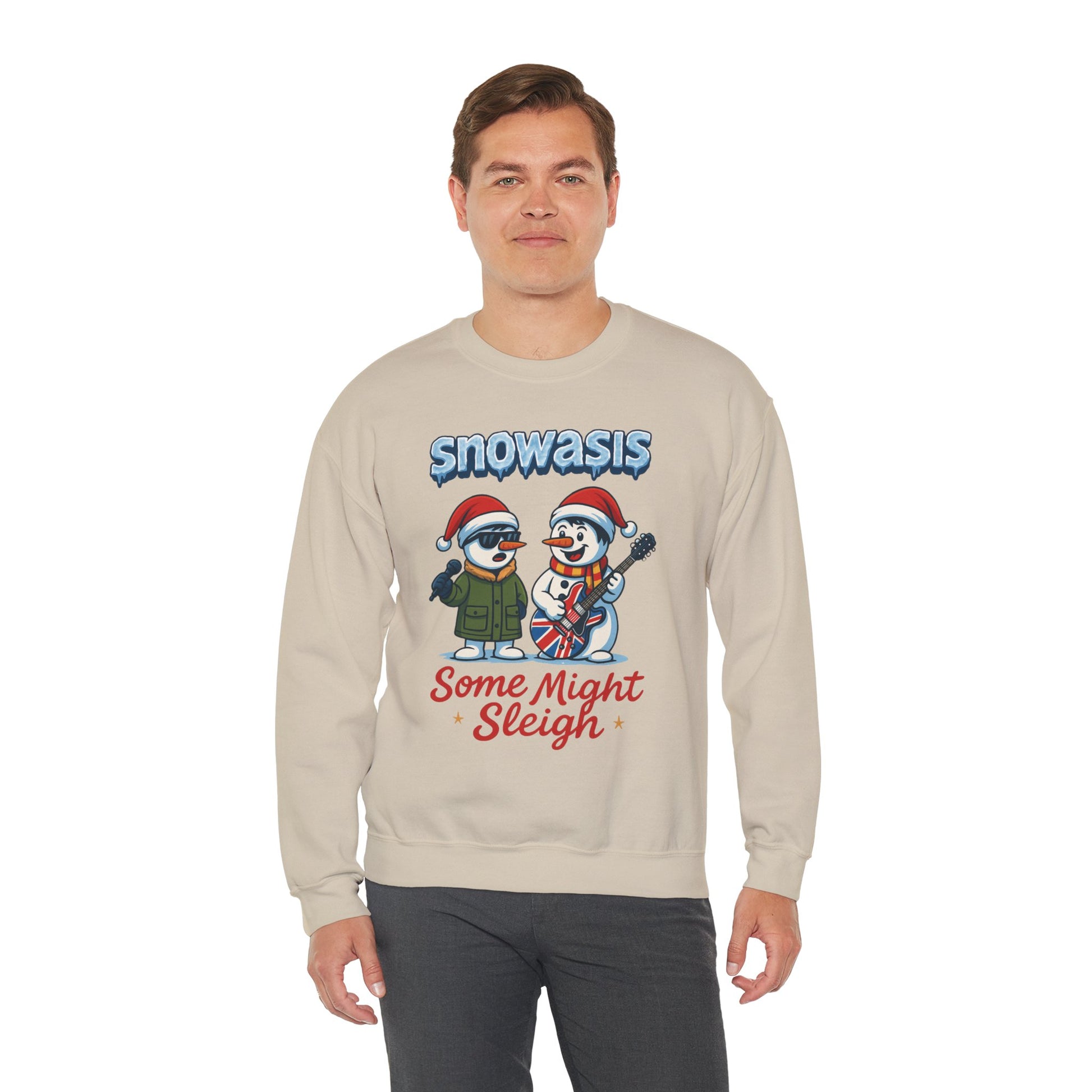 Bring festive rock vibes with this men’s “Snowasis – Some Might Sleigh” sweatshirt! Cool snowmen, music spirit, and Christmas humor — perfect for winter parties, gifts, and fun-loving men. The Gildan 18000 sweatshirt is a unisex heavy blend crewneck made from a 50/50 cotton-polyester fabric, combining softness with lasting durability. Its smooth surface supports crisp, vibrant prints and embroidery, while the ribbed-knit collar and reinforced cuffs help it keep its shape over time. A seamless body design reduces irritation and adds to overall comfort. Practical, sturdy, and print-friendly, the Gildan 18000 sweatshirt remains a top choice for custom apparel. Disclaimers:- Due to the fabric properties, the White color variant may appear off-white rather than bright white. - Subtle orange hue shifts with lighting in the Orange color variant. .: The Gildan 18000 sweatshirt is built for comfort and durability, made from a medium-heavy (8.0 oz/yd² (271 g/m²)) 50/50 cotton-polyester blend. .: The classic fit along with the crew neckline deliver a comfy wearing experience with a clean-cut style. Meanwhile, the double-needle stitching at the shoulder, armhole, neck, waistband, and cuff seams add top-tier durability. .: Say goodbye to itchiness thanks to the gray, pearlized tear-away label. .: The Gildan 18000 sweatshirt is crafted from ethically grown US cotton and backed by the US Cotton Trust Protocol, with OEKO-TEX certified dyes that meet safety and environmental standards. .: Fabric blends: Heather Sport colors - 60% polyester, 40% cotton .: Embroidery decoration method available on either left chest, center chest, or large center chest, as well as right + left wrists