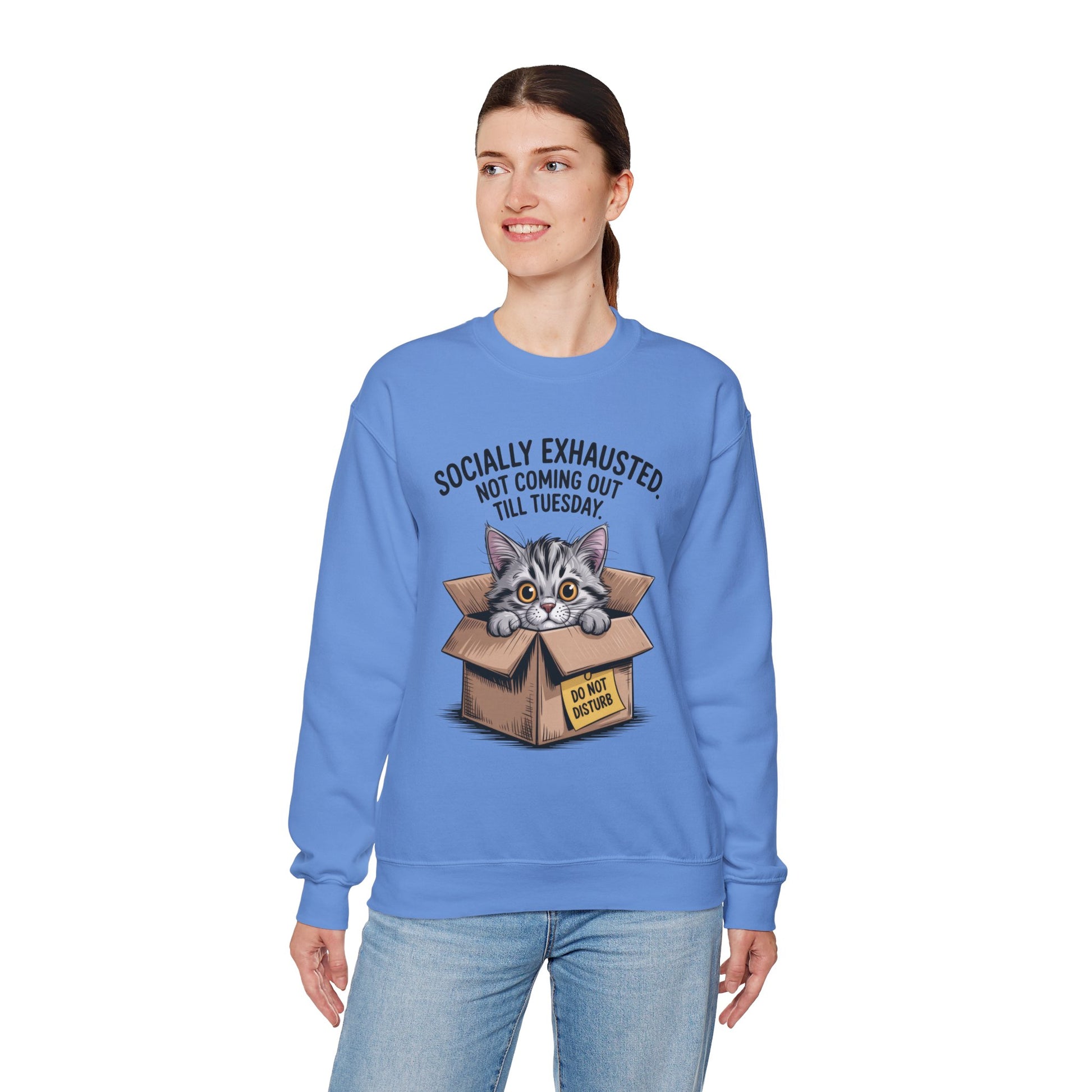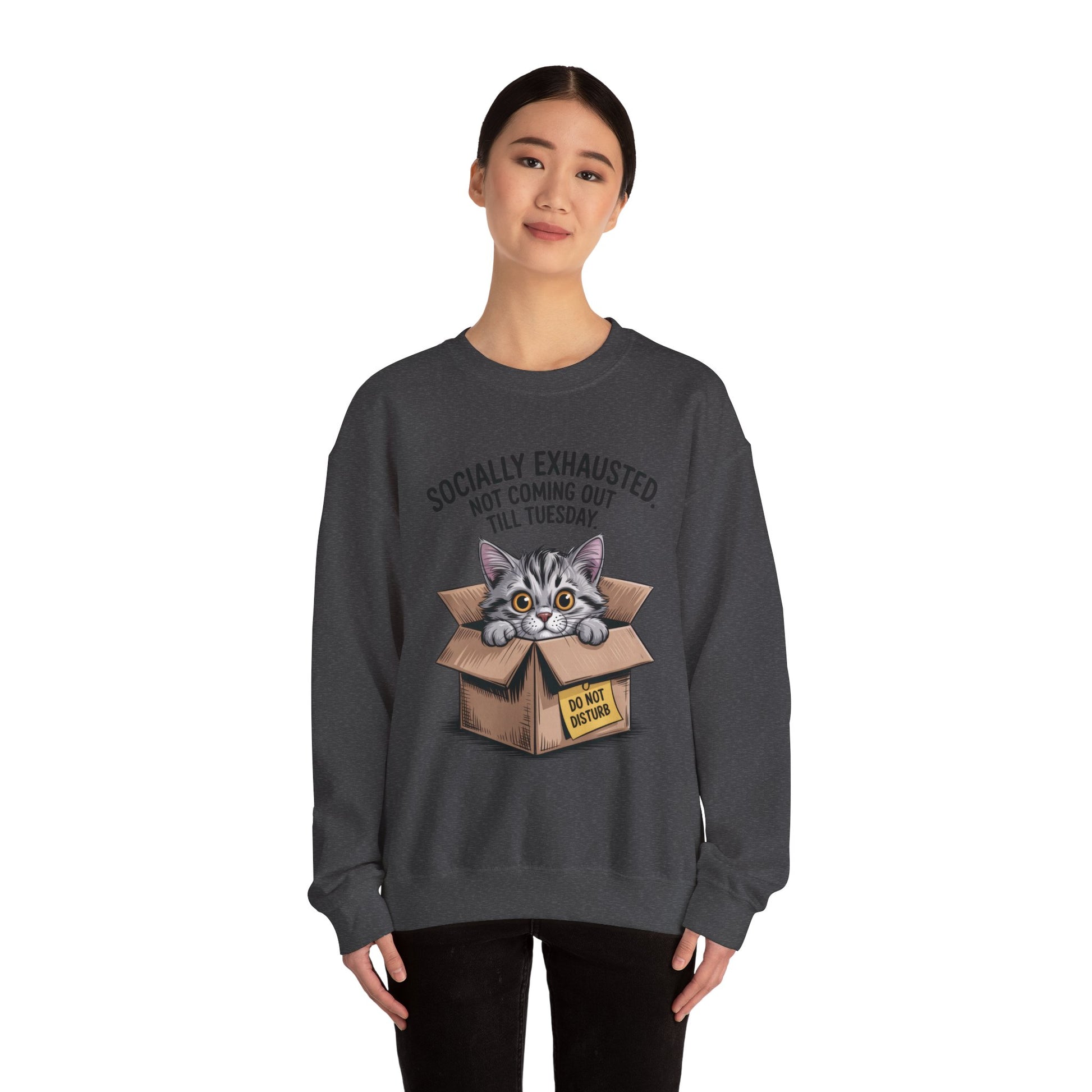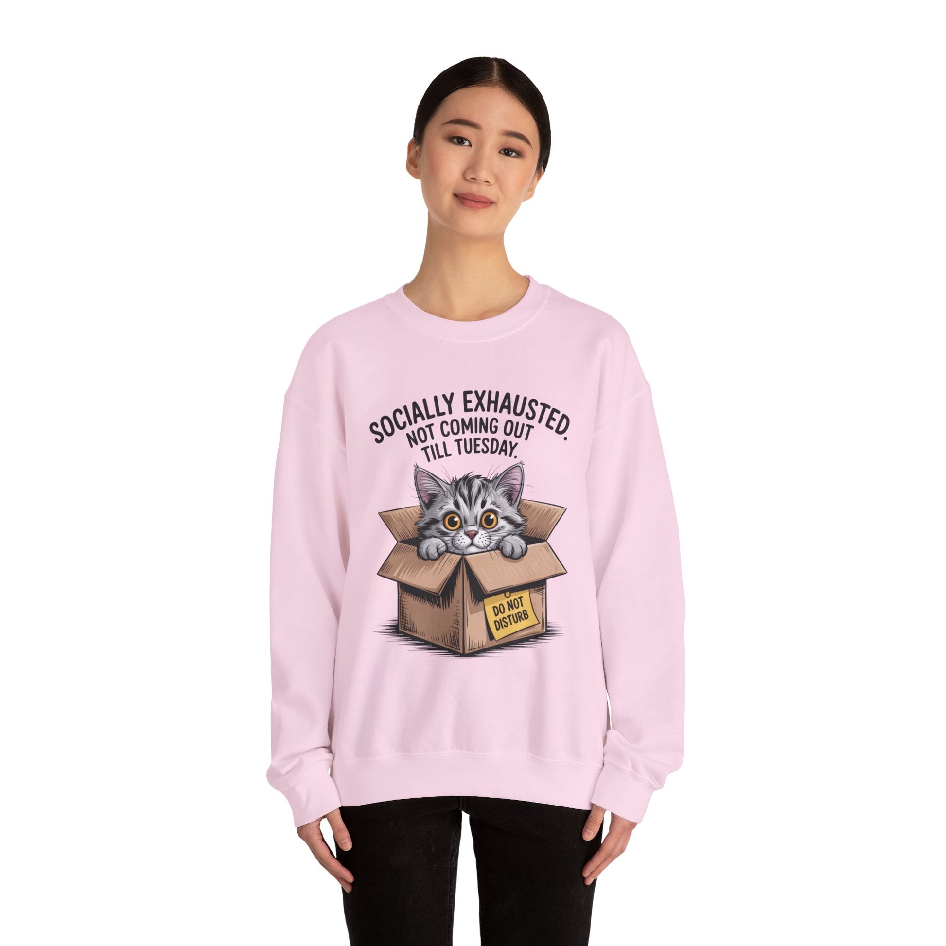 Socially Exhausted Cat Sweatshirt, Funny Cat Crewneck, Gift for Cat Lovers, Cozy Unisex Pullover, Weekend Comfort Apparel