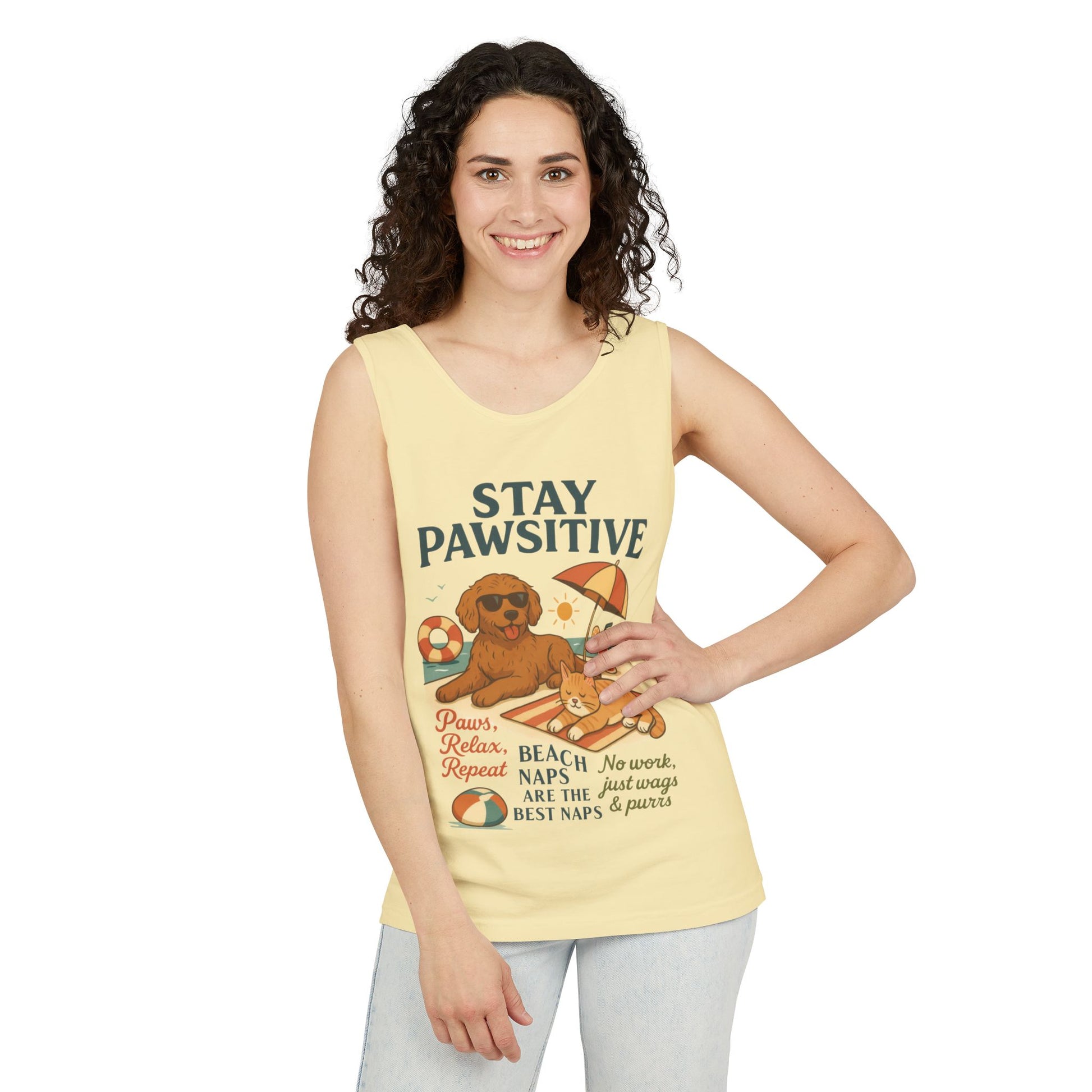 Stay Pawsitive Womens Tank, Cute Dog & Cat Beach Tee, Summer Pet Lover Tee, Animal Graphic Heavy Cotton Tee, Fun Pet Lovers Gift, Summer Top