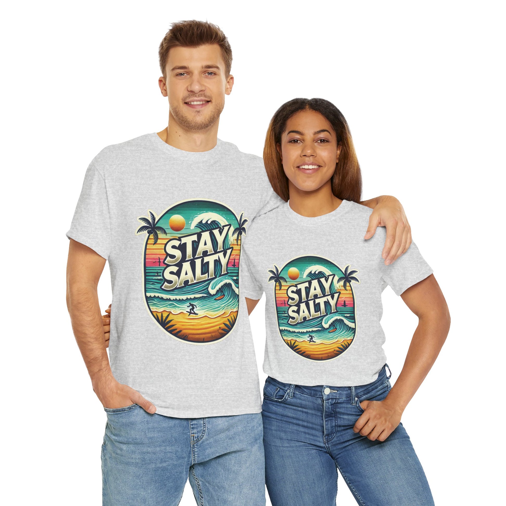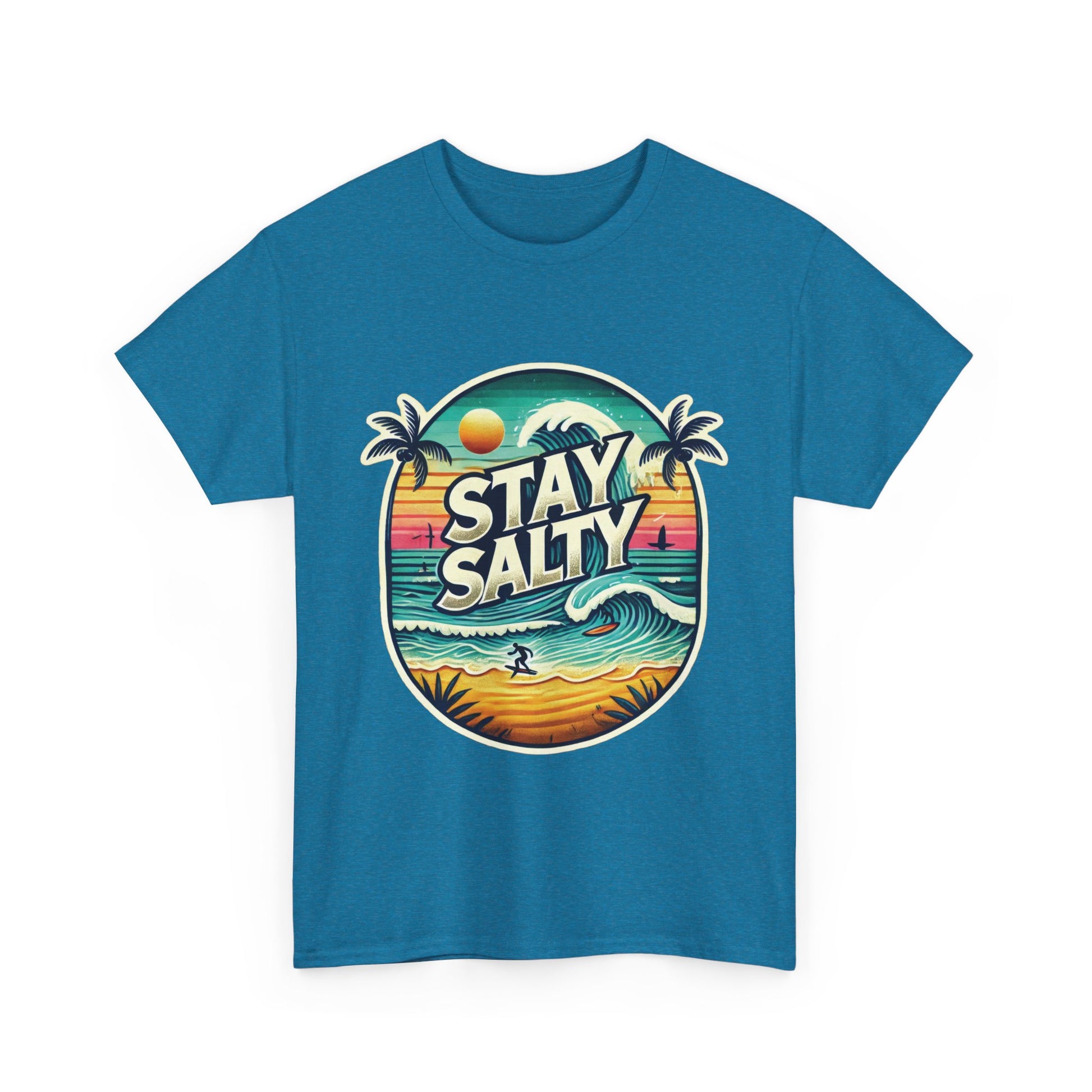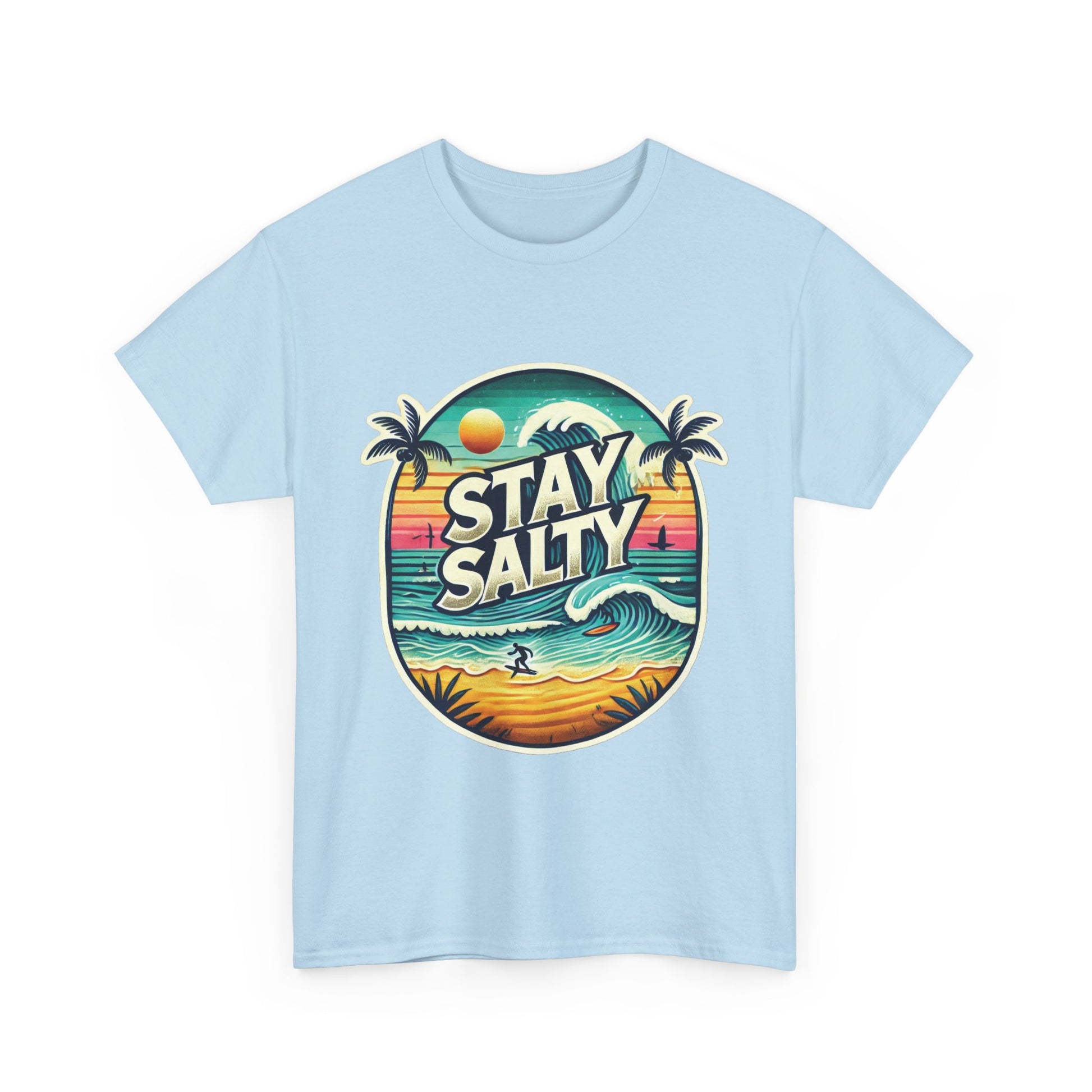 Stay Salty Retro Surf Unisex Heavy Cotton Tee, Vintage Beach Sunset Graphic T-Shirt, Summer Ocean Wave Surfer Shirt, Ocean Lover Gift