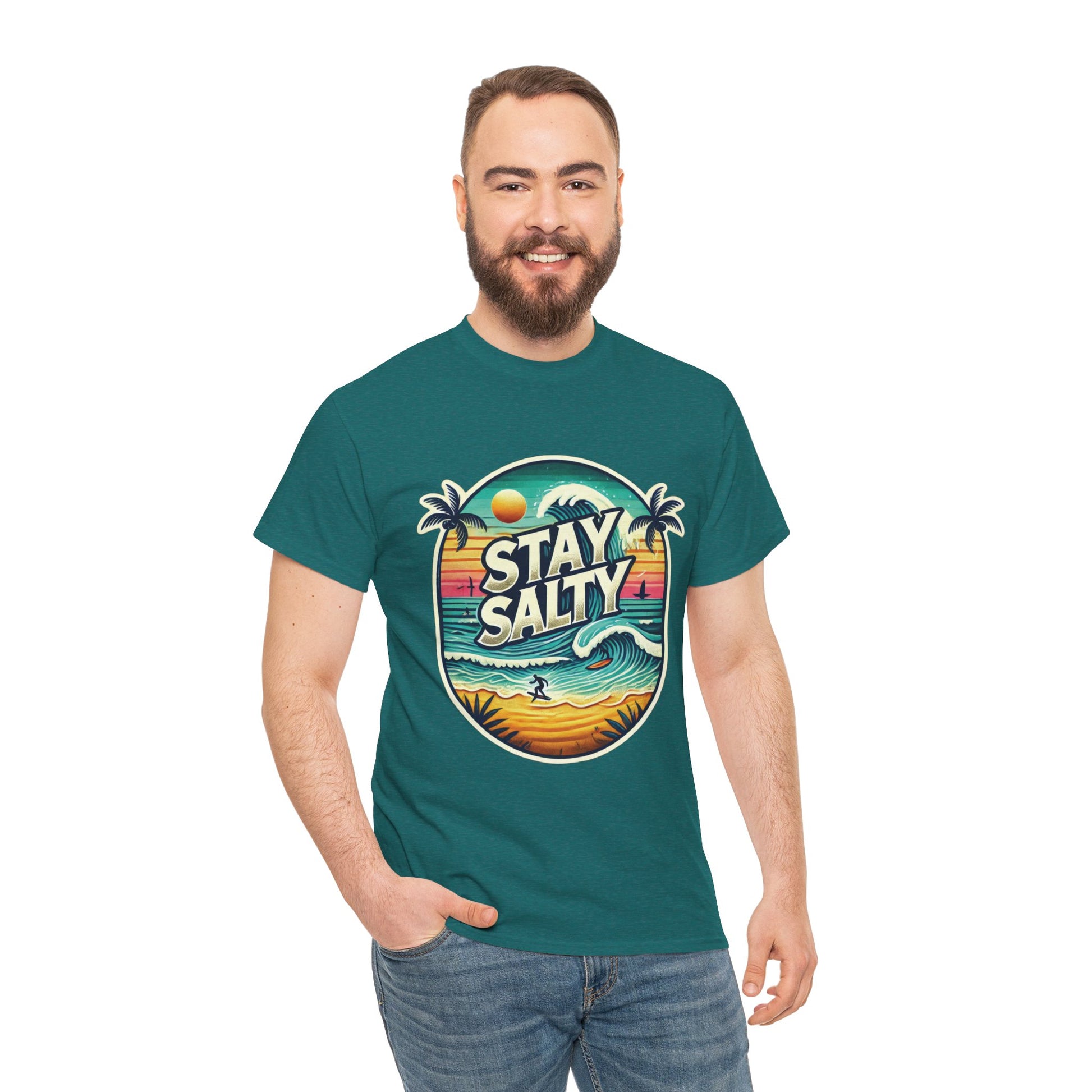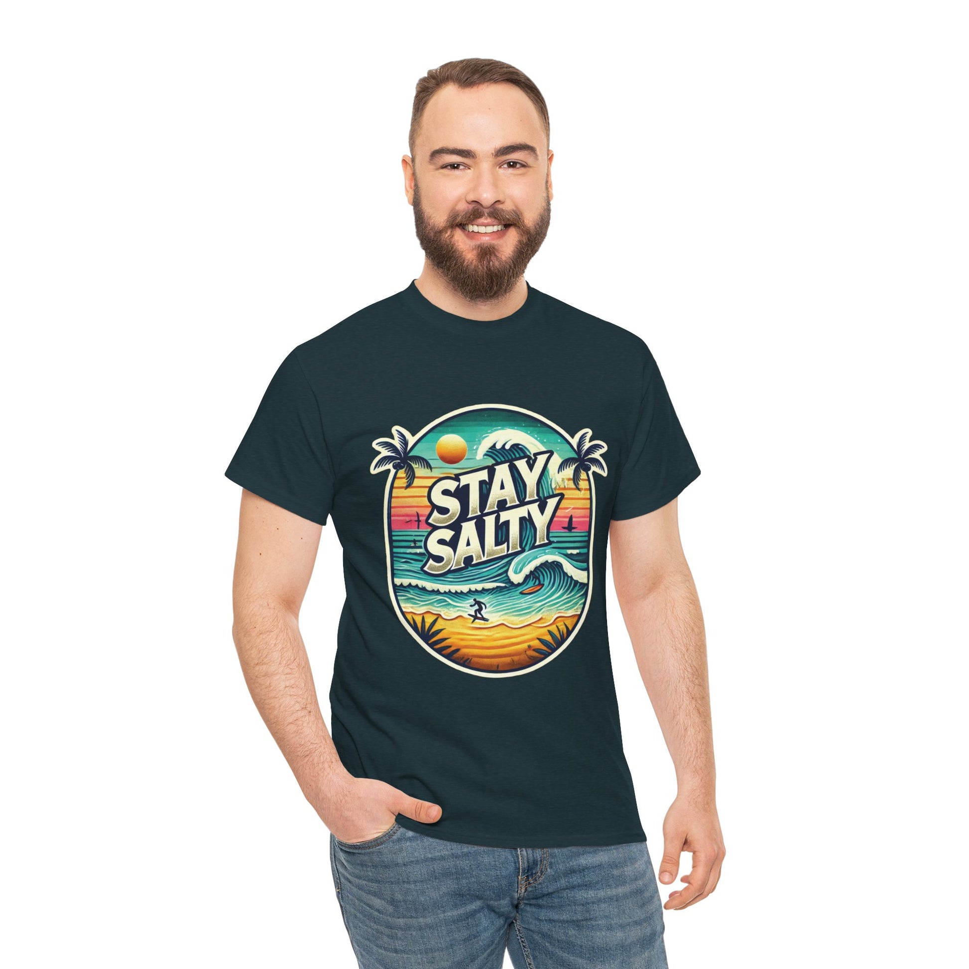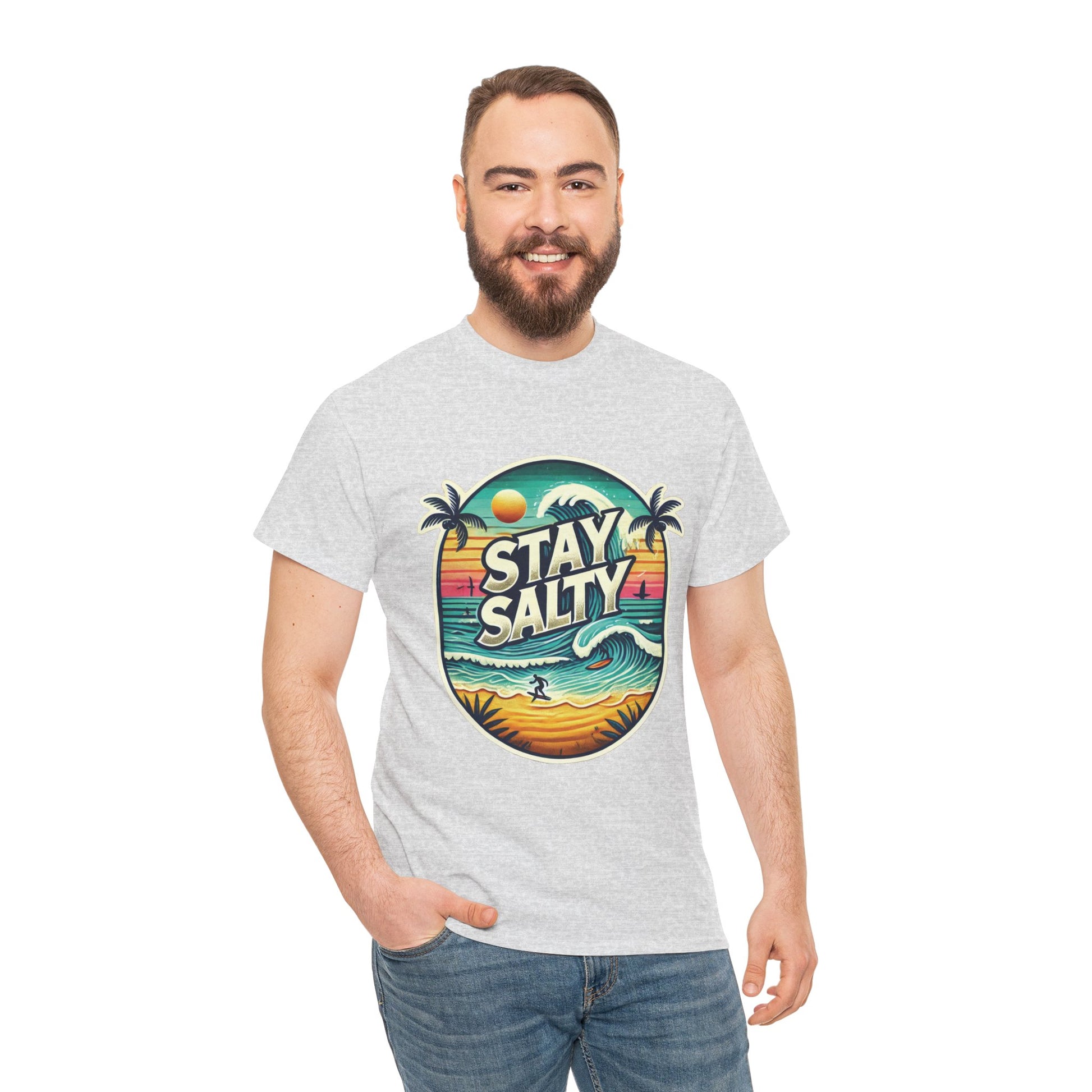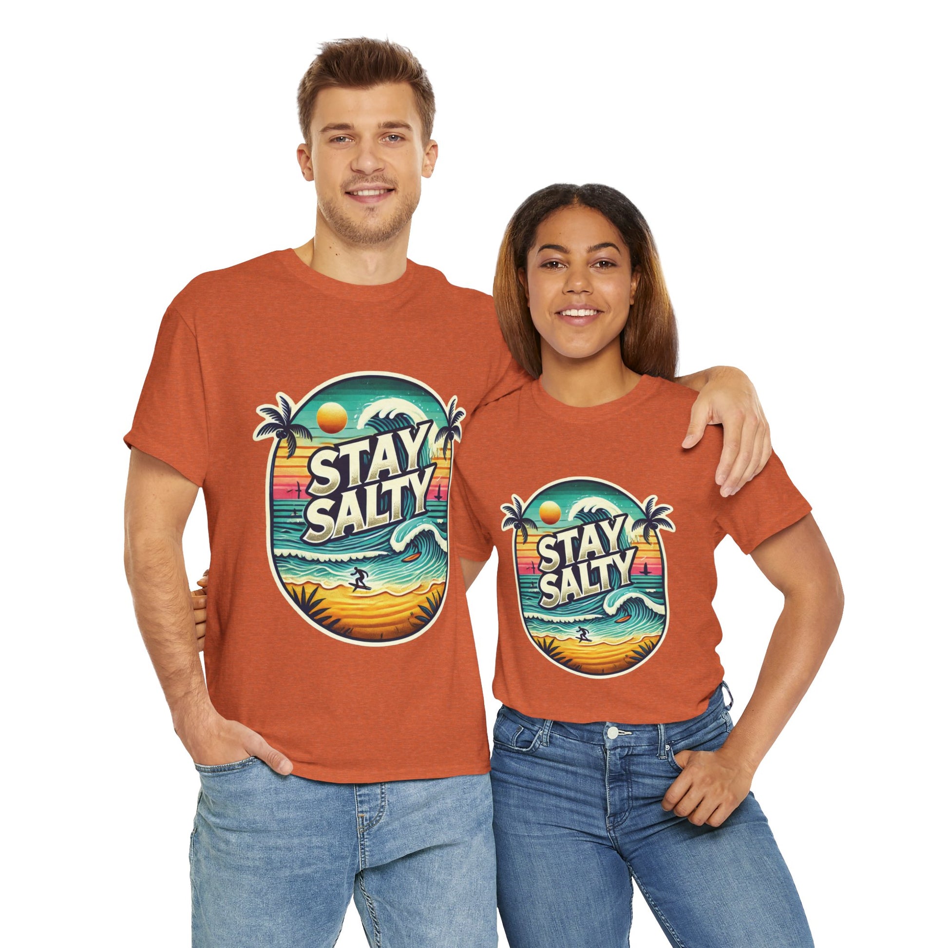 Stay Salty Retro Surf Unisex Heavy Cotton Tee, Vintage Beach Sunset Graphic T-Shirt, Summer Ocean Wave Surfer Shirt, Ocean Lover Gift