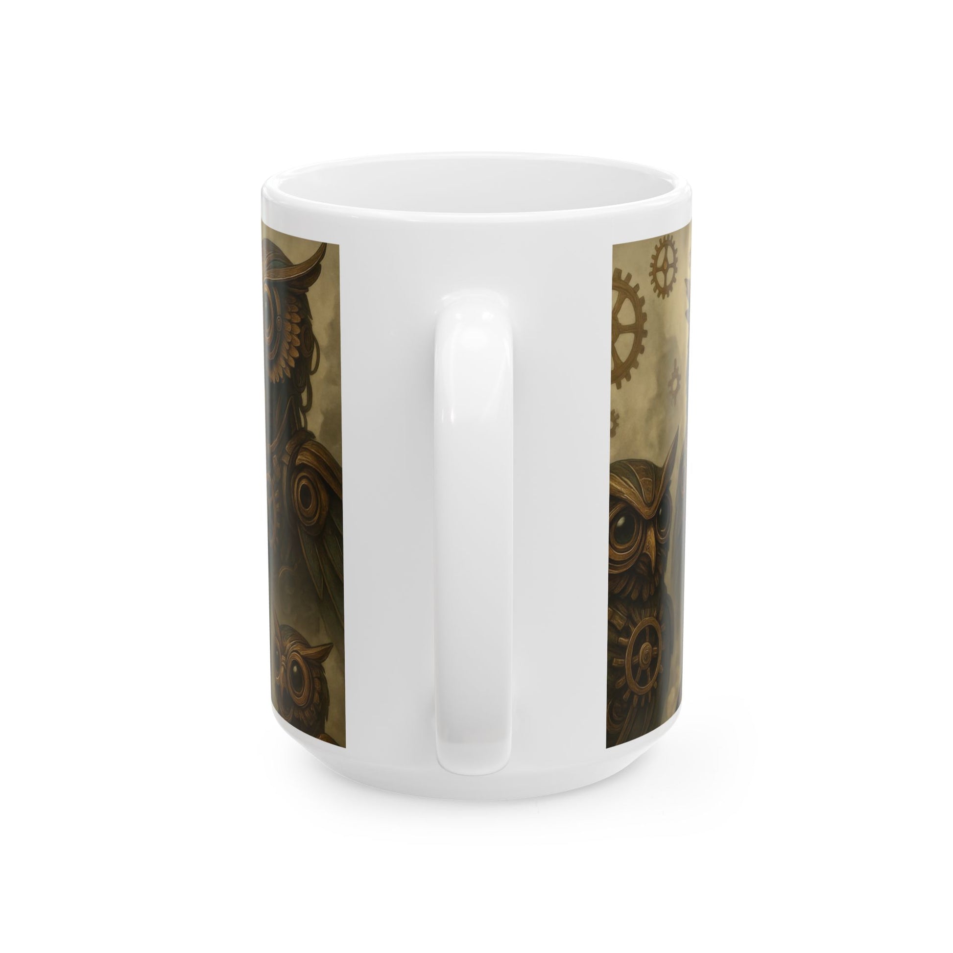 Steampunk Owl Mug, Victorian Mechanical Owl Coffee Cup, Brass Gear Owl Art, Industrial Fantasy Gift for Men & Steampunk Lovers, Mug, (15oz)