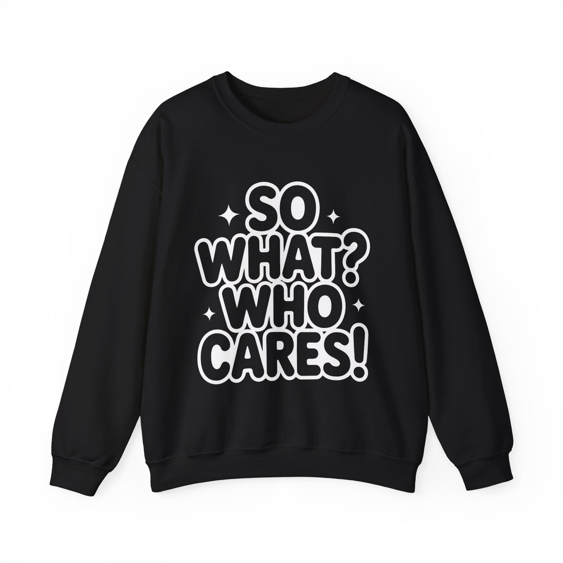 Trendy Womens Crewneck Sweatshirt with 'So What? Who Cares!' Print, Funny Typography Sweater, Sassy Graphic Sweater for Women