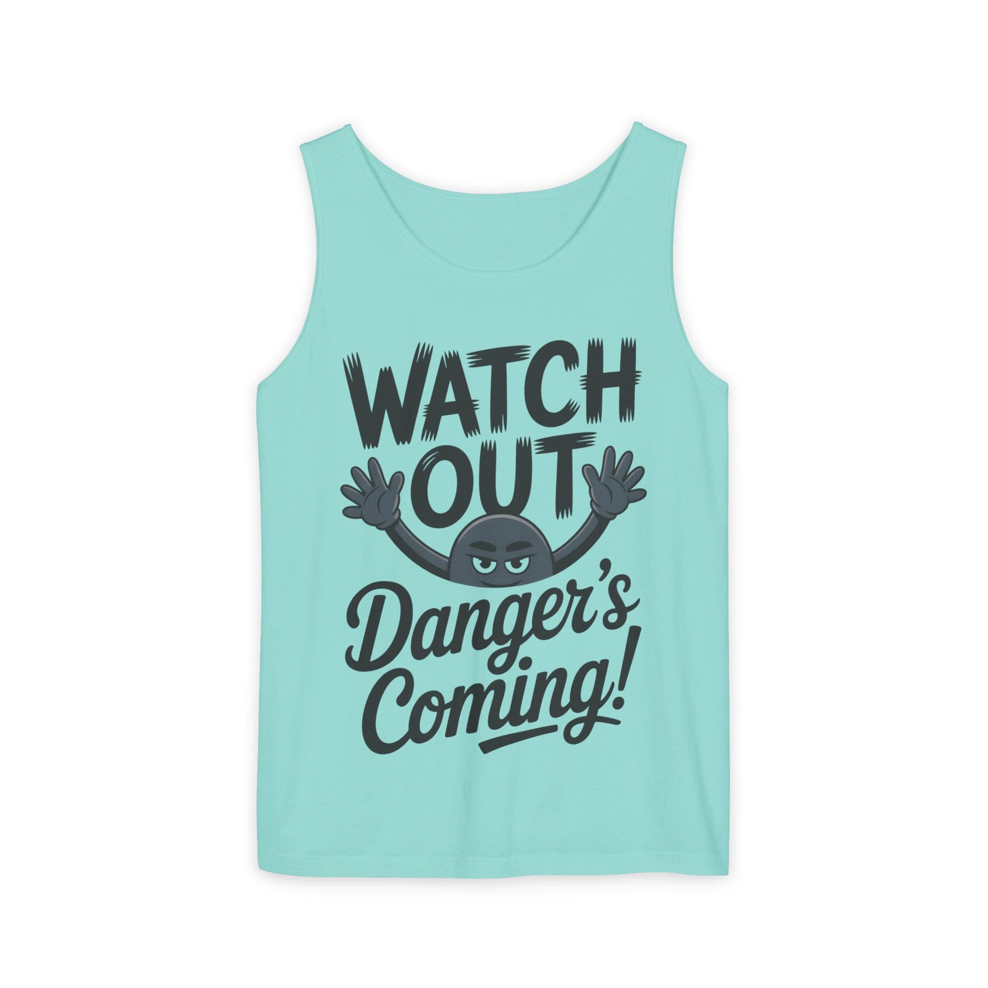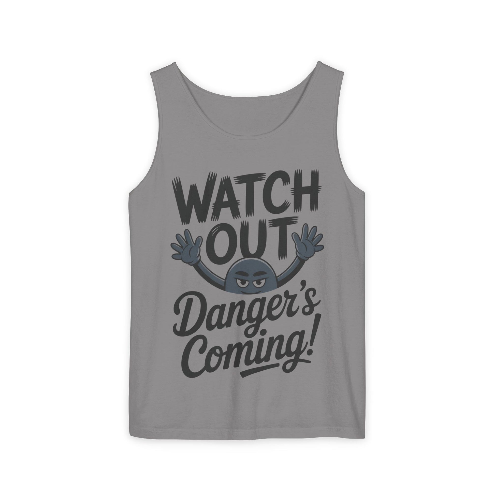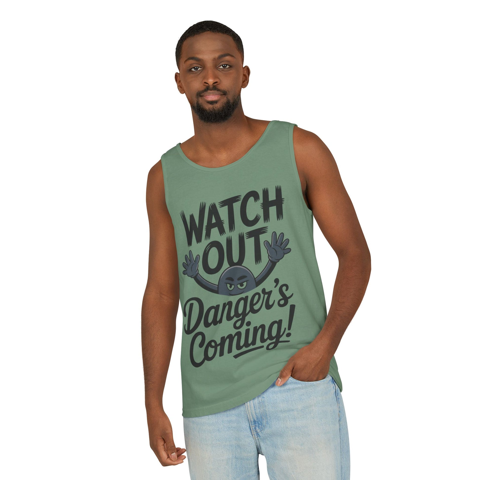 Watch Out! Danger's Coming, Mens Garment-Dyed Tank Top, Summer Tank, Trendy Mens Top, Fun Graphic Tee, Casual Wear, Gift for Him
