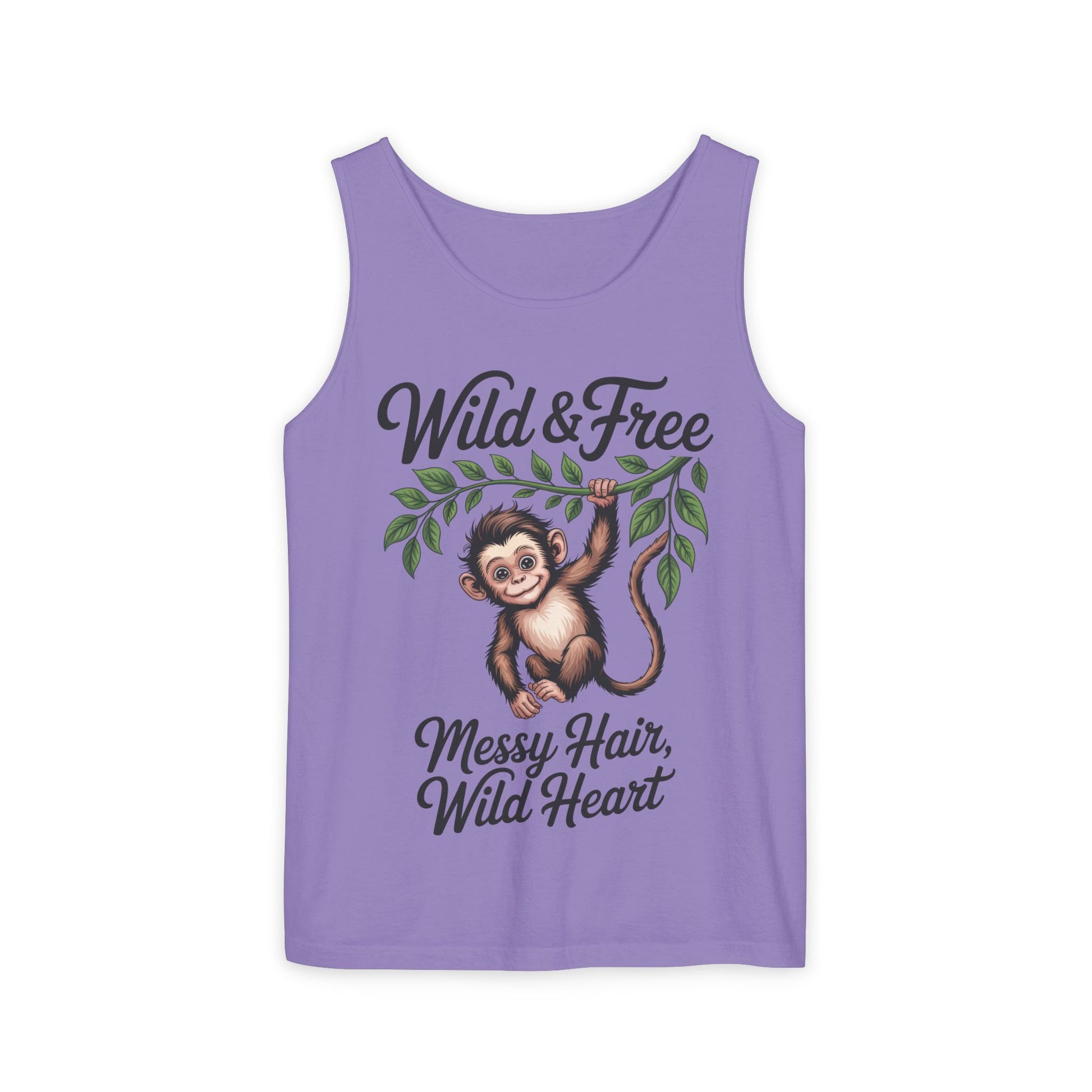 Embrace your adventurous spirit with this Unisex Garment-Dyed Tank Top, perfect for those who live life freely and joyfully. The playful design featuring a whimsical monkey embodies the spirit of being 'Wild & Free.' It's a versatile piece that seamlessly fits into a casual wardrobe, ideal for sunny days at the beach, picnics in the park, or just lounging at home. This tank top is perfect for anyone who cherishes a carefree lifestyle and is looking to express themselves through fun and colorful fashion. Celebrate occasions like summer festivals, casual get-togethers, or outdoor adventures with this stylish tank that radiates positivity and good vibes! Product features - 100% Ring spun cotton for a soft, durable fabric. - Self fabric binding adds a polished finish. - Without side seams for added comfort and reduced waste. - Garment-dyed process for unique colors and texture. - Relaxed fit perfect for casual wear. Care instructions - Machine wash: cold (max 30C or 90F) - Non-chlorine: bleach as needed - Tumble dry: low heat - Iron, steam or dry: low heat - Do not dryclean