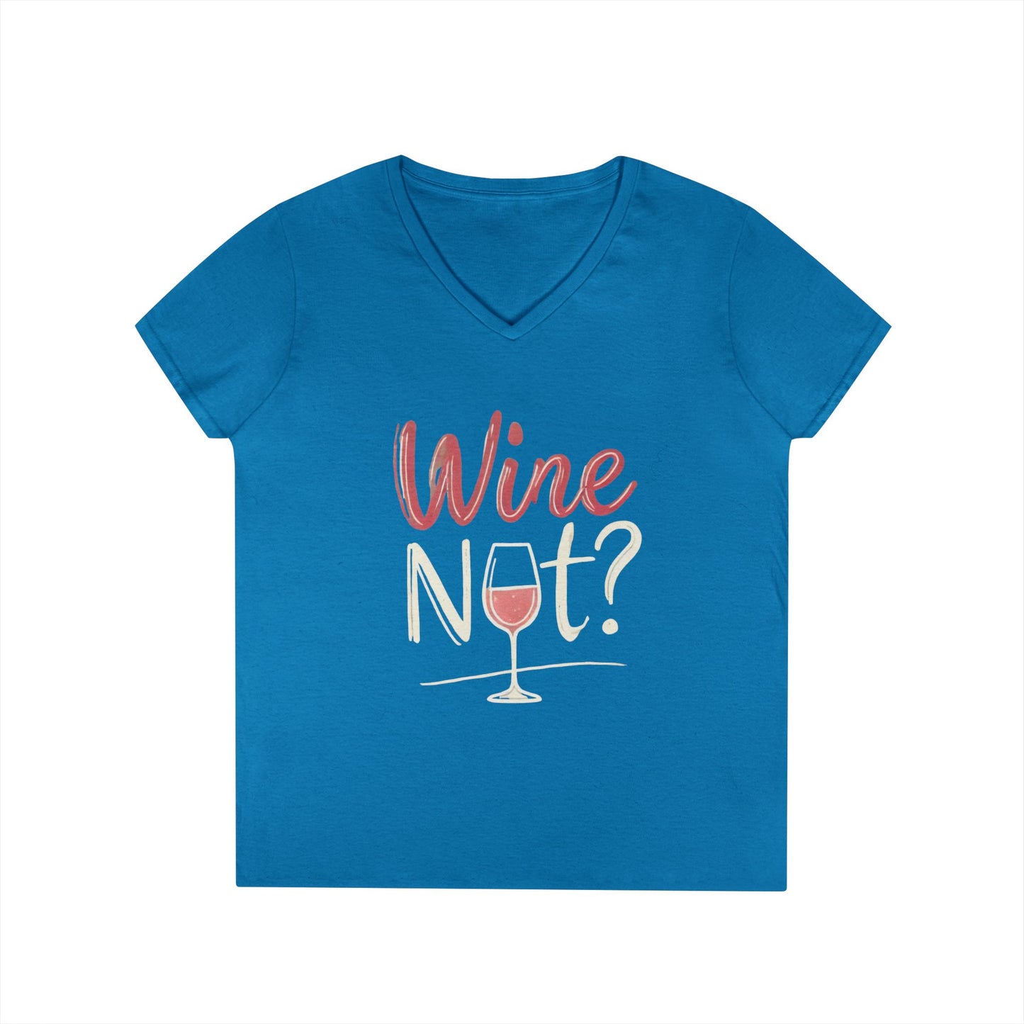 This Ladies' V-Neck T-Shirt combines comfort and style, perfect for casual outings or cozy evenings at home. The playful 'Wine Not?' design brings a fun vibe, making it an ideal choice for wine lovers and social gatherings. Whether you’re hosting a wine night with friends or enjoying a laid-back weekend, this shirt adds a charming touch to your wardrobe. It's great for celebrating birthdays, girls' nights, or just indulging in your love for wine. Ideal for women who embrace humor and enjoy expressing themselves through fashion. Product features - Ribbed knit collar for shape retention - Shoulder tape for added stability - Durable double needle hems - Soft and strong 100% cotton fabric - Semi-fitted style for a flattering look Care instructions - Machine wash: cold (max 30C or 90F) - Do not bleach - Do not tumble dry - Iron, steam or dry: low heat - Do not dryclean