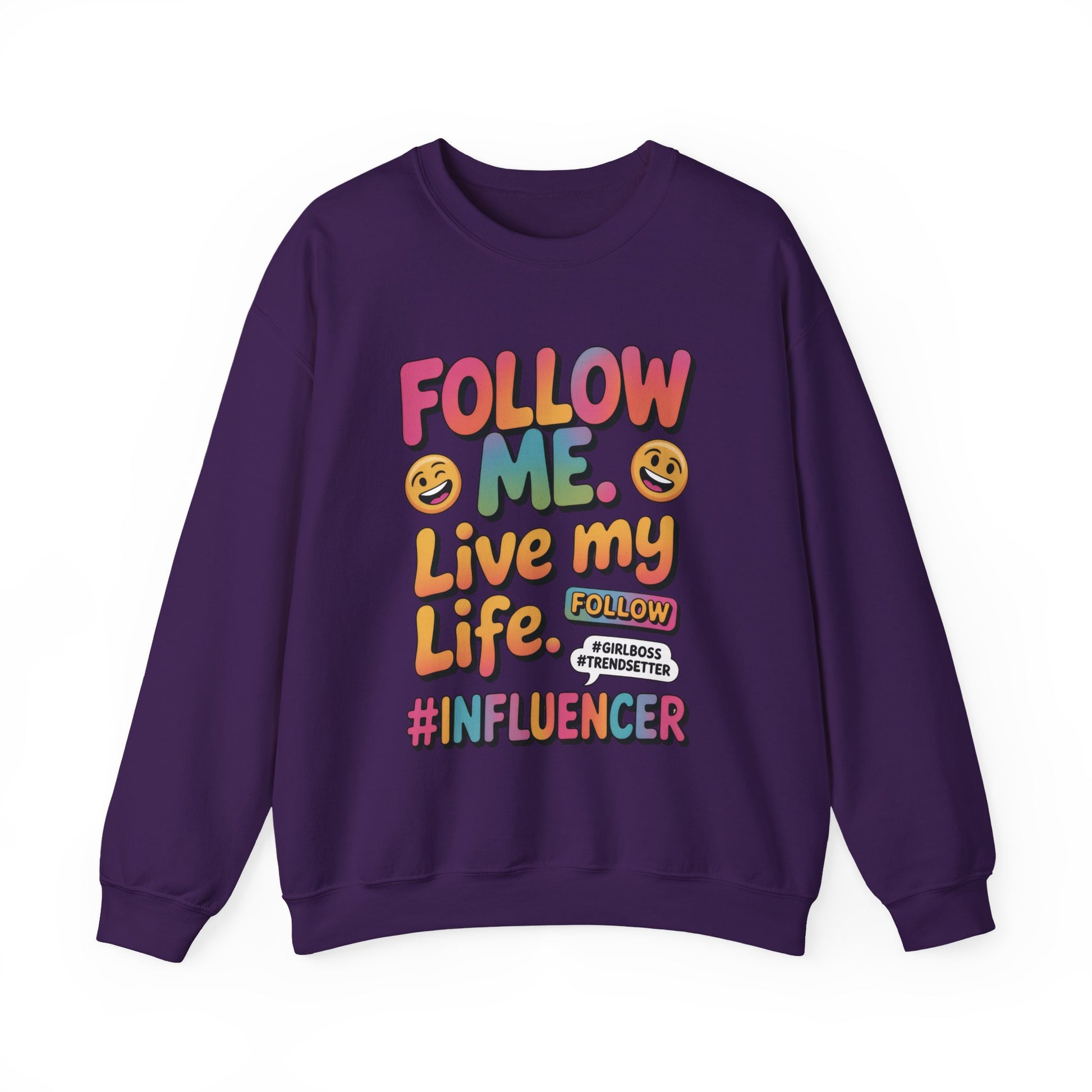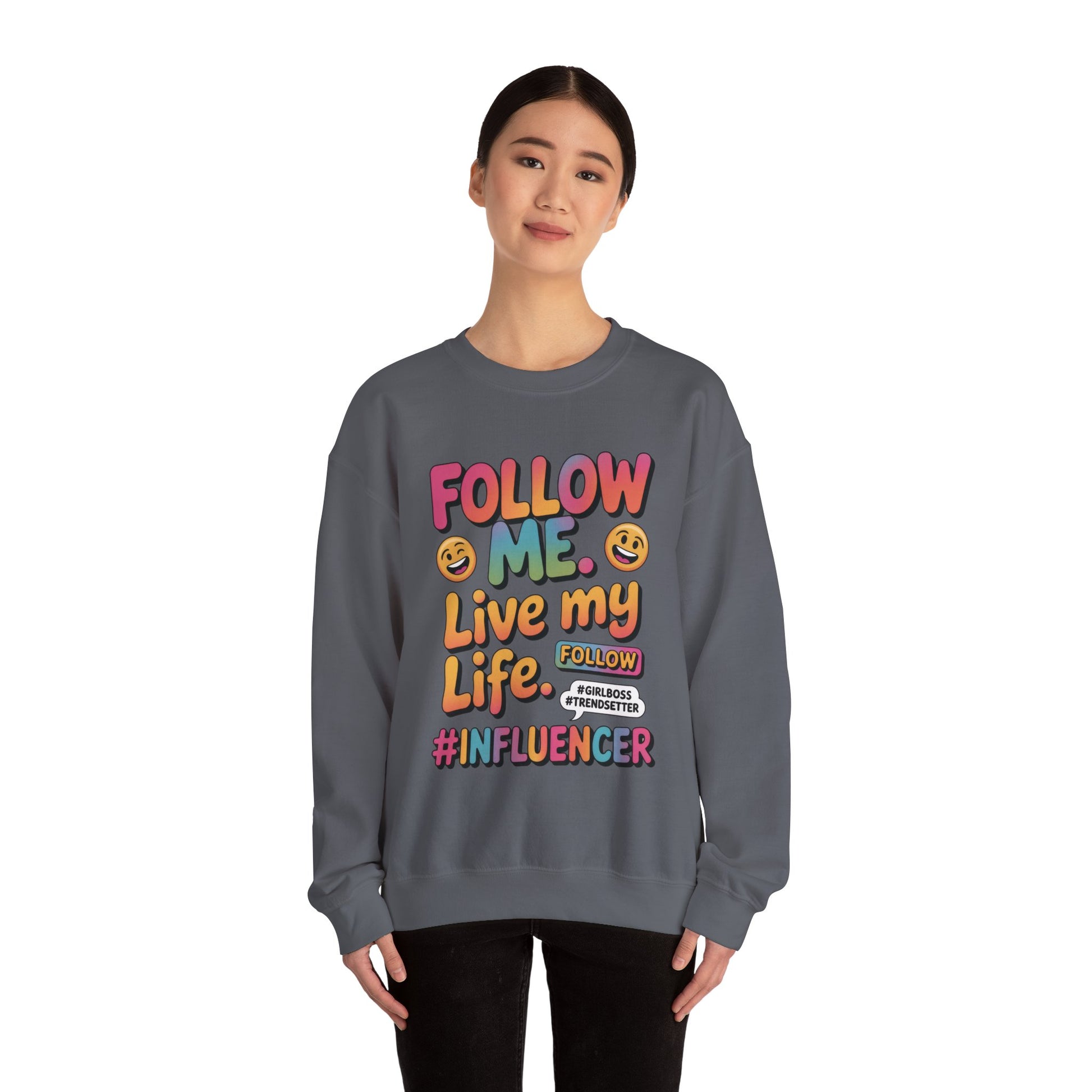 Womens Heavy Blend™ Crewneck Sweatshirt, Influencer Sweatshirt, Colorful Follow Me Live My Life Graphic Sweatshirt, Trendy GirlBoss Outfit