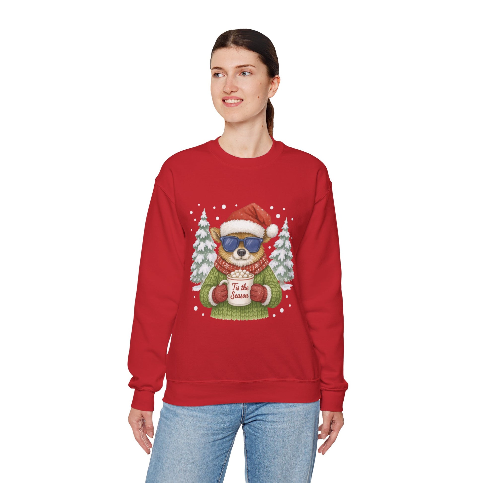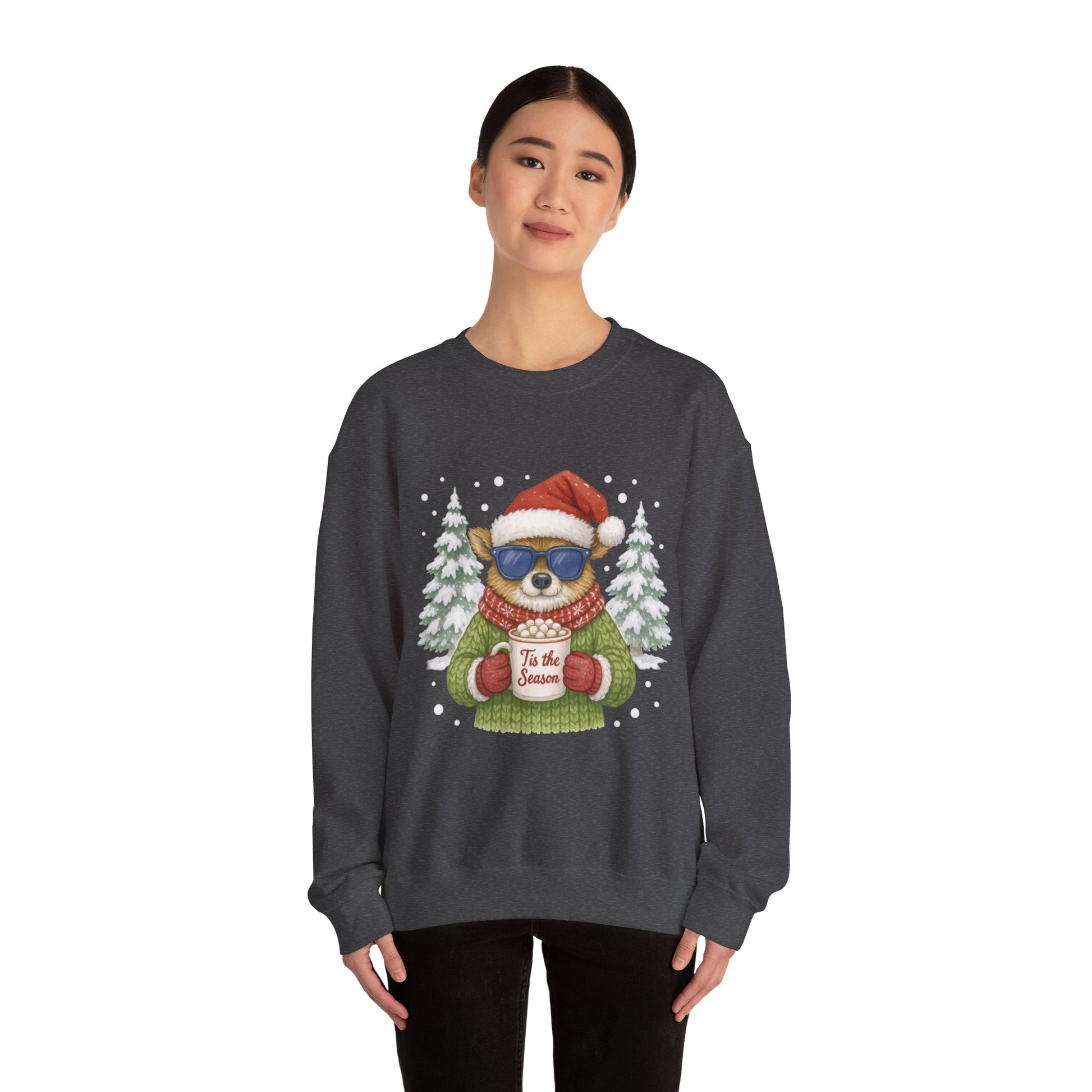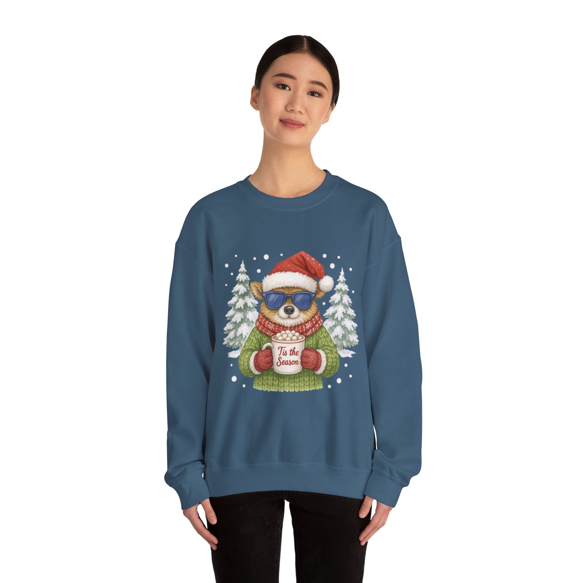 Stay warm and stylish this winter with the “Tis the Season” women’s Christmas sweatshirt. Featuring a fashionable reindeer holding a cozy mug, it’s perfect for festive mornings, holiday parties, and lounging by the fire. A must-have for your Christmas collection! The Gildan 18000 sweatshirt is a unisex heavy blend crewneck made from a 50/50 cotton-polyester fabric, combining softness with lasting durability. Its smooth surface supports crisp, vibrant prints and embroidery, while the ribbed-knit collar and reinforced cuffs help it keep its shape over time. A seamless body design reduces irritation and adds to overall comfort. Practical, sturdy, and print-friendly, the Gildan 18000 sweatshirt remains a top choice for custom apparel. Disclaimers:- Due to the fabric properties, the White color variant may appear off-white rather than bright white. - Subtle orange hue shifts with lighting in the Orange color variant. .: The Gildan 18000 sweatshirt is built for comfort and durability, made from a medium-heavy (8.0 oz/yd² (271 g/m²)) 50/50 cotton-polyester blend. .: The classic fit along with the crew neckline deliver a comfy wearing experience with a clean-cut style. Meanwhile, the double-needle stitching at the shoulder, armhole, neck, waistband, and cuff seams add top-tier durability. .: Say goodbye to itchiness thanks to the gray, pearlized tear-away label. .: The Gildan 18000 sweatshirt is crafted from ethically grown US cotton and backed by the US Cotton Trust Protocol, with OEKO-TEX certified dyes that meet safety and environmental standards. .: Fabric blends: Heather Sport colors - 60% polyester, 40% cotton .: Embroidery decoration method available on either left chest, center chest, or large center chest, as well as right + left wrists