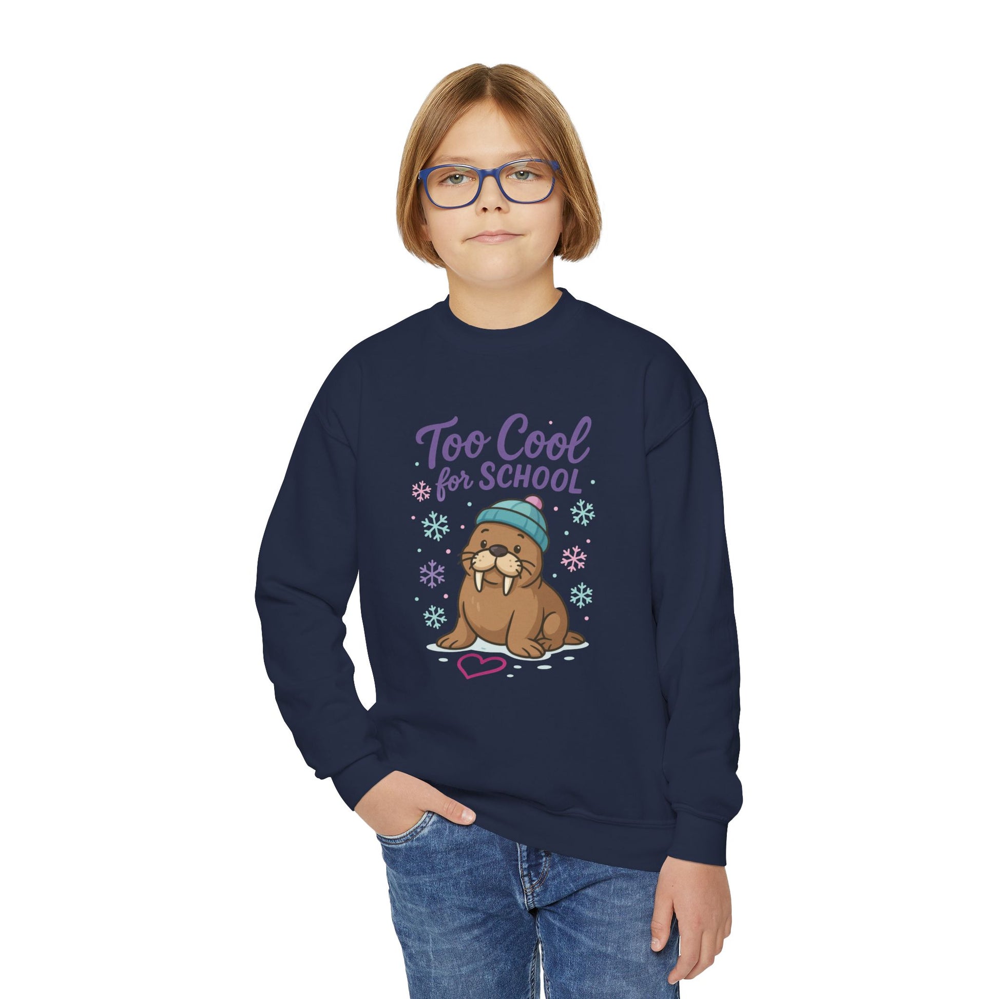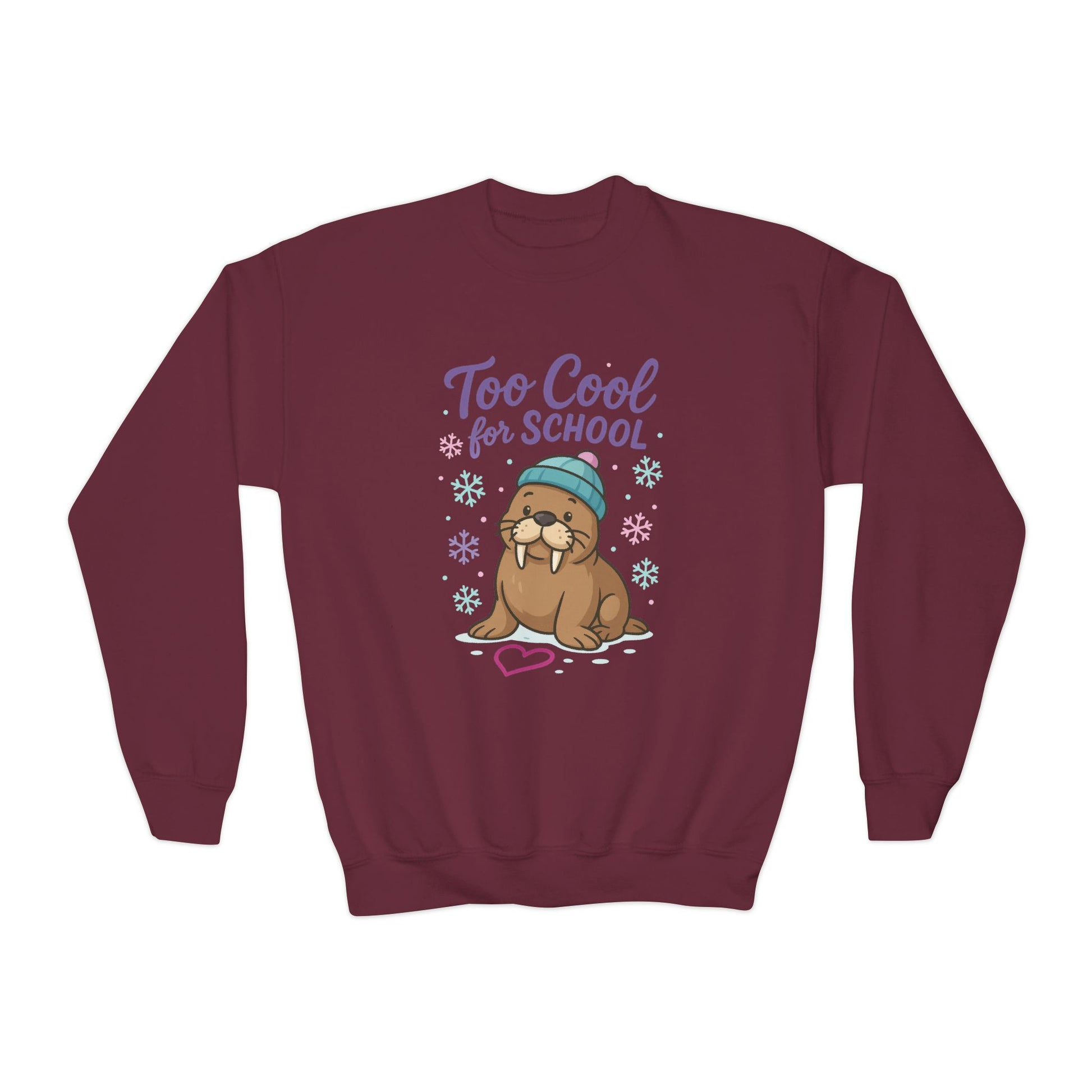 Youth Crewneck Sweatshirt, Kids Too Cool for School Walrus Sweatshirt, Funny Animal Pullover, Cute Winter Top