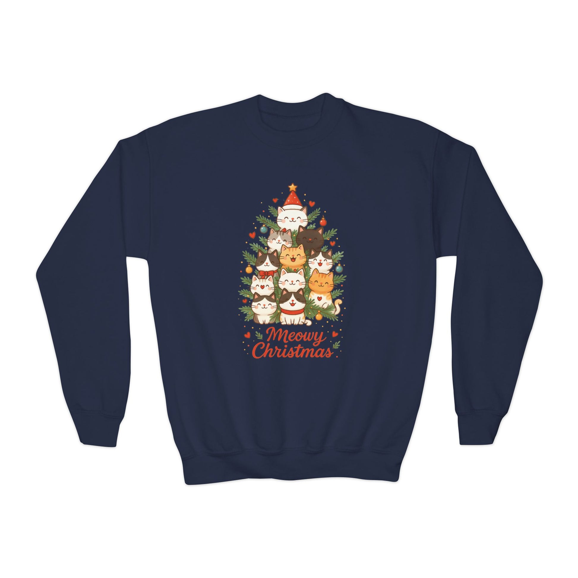 Youth Meowy Christmas Cat Sweatshirt, Cute Holiday Kitty Jumper